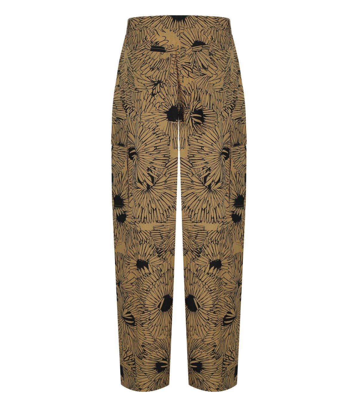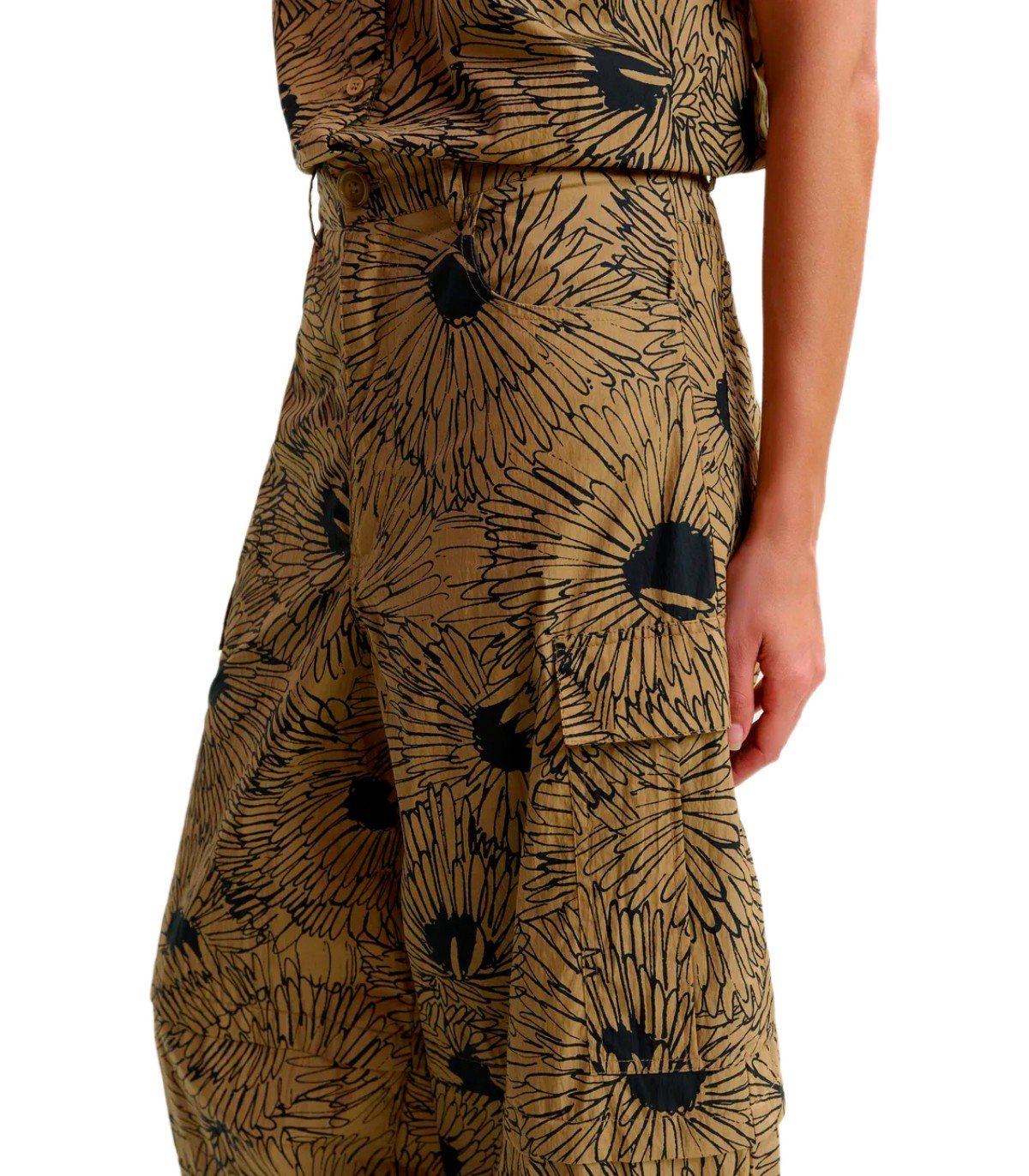 Josy-Hose von Essentiel Antwerp aus beigefarbenem Baumwollmischgewebe gefertigt und mit einem kontrastierenden Blumenmuster verziert. Sie verfügt über zahlreiche Cargotaschen, einen Reißverschluss mit Knopf, einen niedrigen Bund und ein weites Bein. Bequeme Passform.