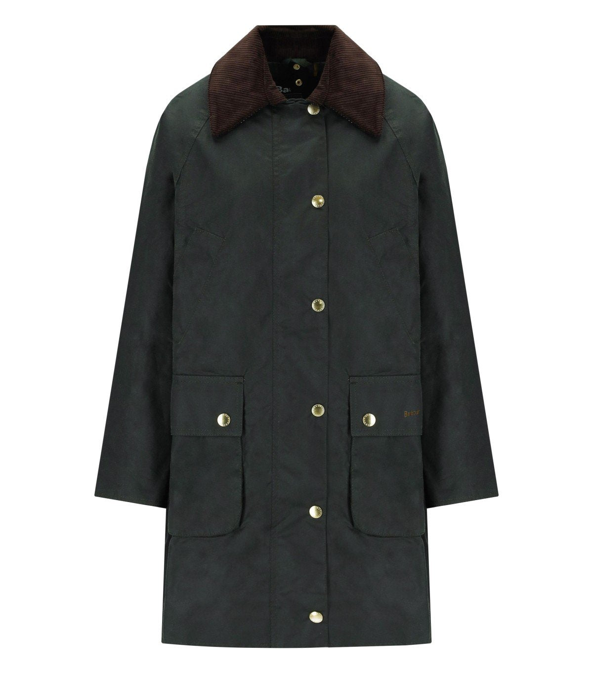 Barbour Beadnell Jacke aus gewachster Baumwolle in der Farbe Salbeigrün. Sie verfügt über einen braunen Cordkragen und zwei doppelte Pattentaschen mit Markenknöpfen auf der Vorderseite. Verschluss mit Reißverschluss und goldfarbenen Metallknöpfen mit Markenprägung. Lockerer Schnitt.
