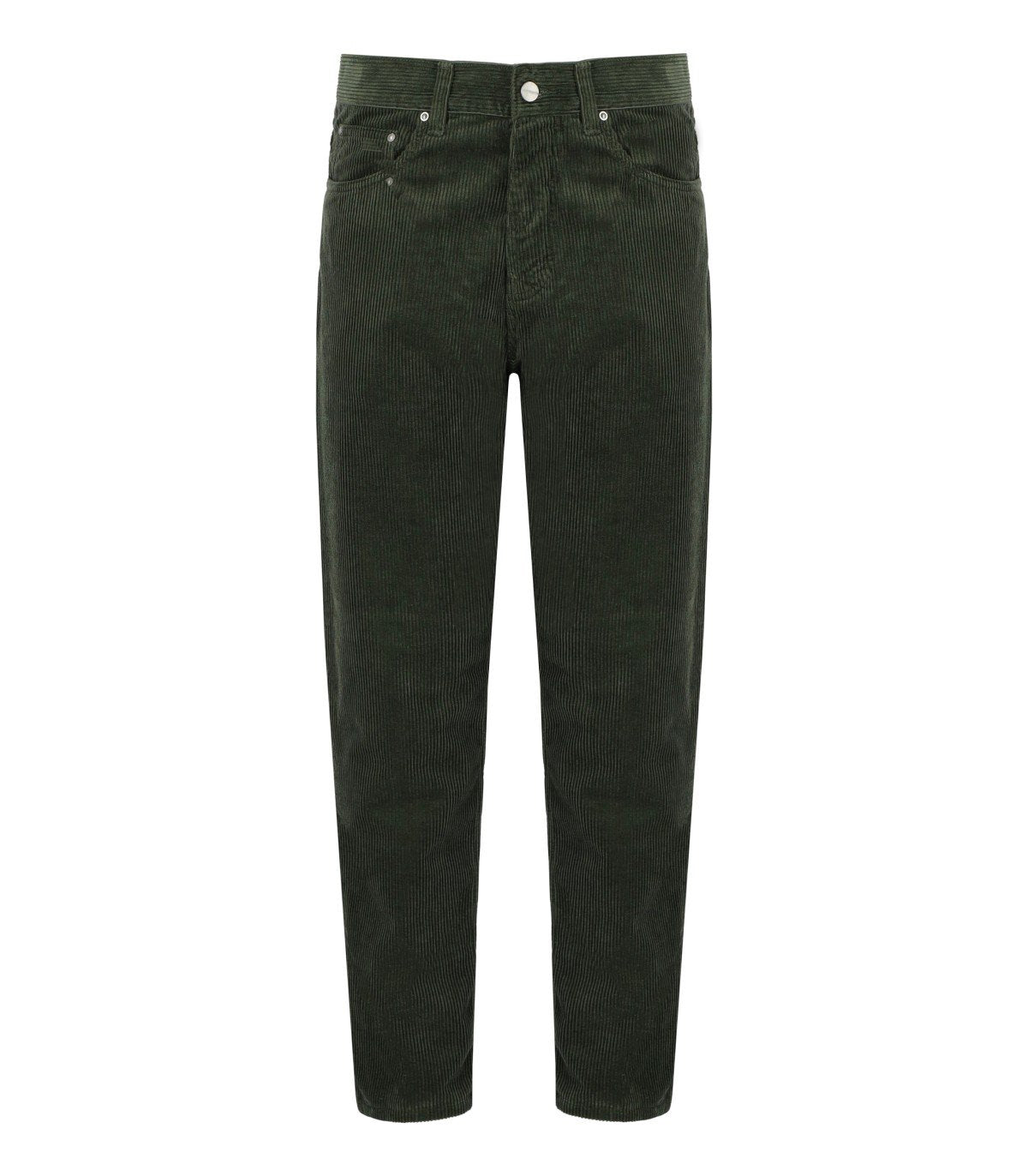 Carhartt Wip Newel Hose aus grünem Baumwollcord gefertigt. Sie verfügt über fünf Taschen, einen Knopfverschluss und Gürtelschlaufen. Aufgesetztes Patch mit gesticktem Logo auf der rechten Gesäßtasche. Lockere, schmal zulaufende Passform. Reguläre Taille.