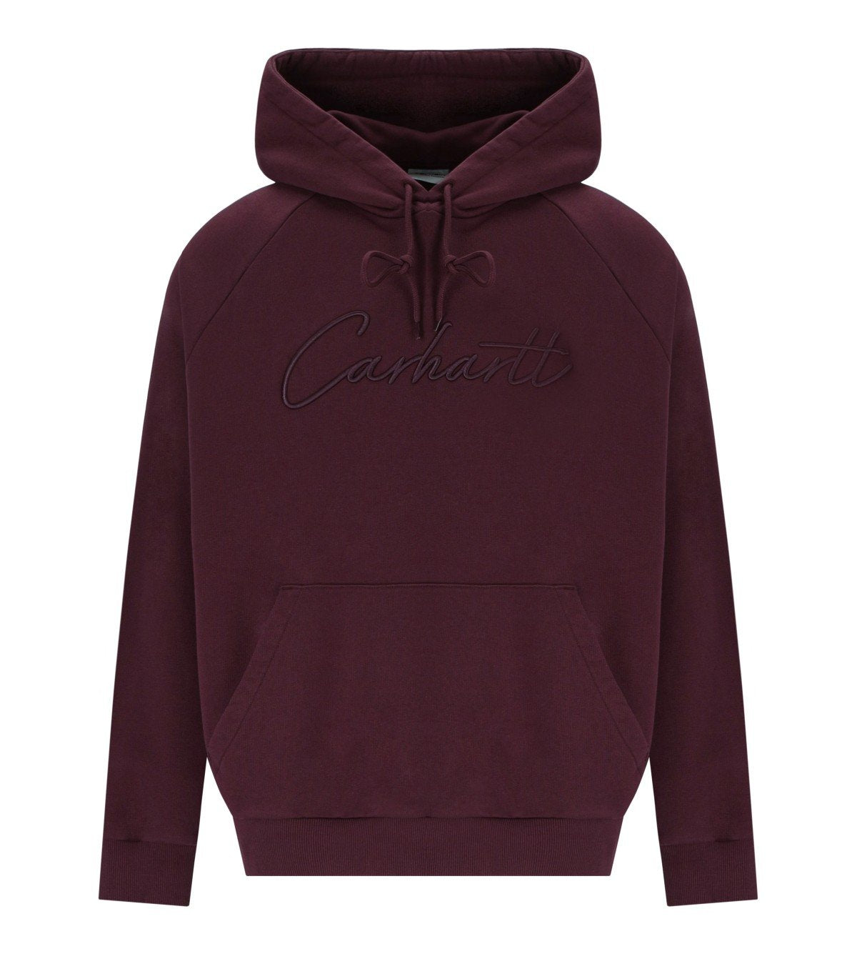 Carhartt Wip Ray Kapuzenpullover aus dickem Baumwollstoff in Bordeaux-Tönen. Er verfügt über eine Kapuze mit verstellbarem Kordelzug und eine Kängurutasche auf der Vorderseite. Rippbündchen an Saum und Ärmeln sowie ein gesticktes Logo auf der Vorderseite. Lockerer Schnitt.
