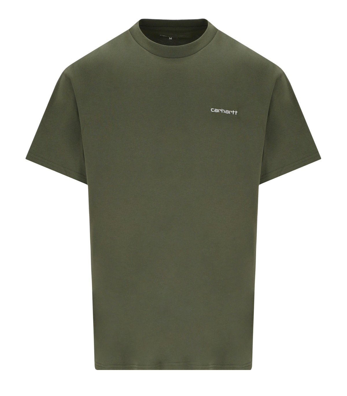 Carhartt Wip S/S Script Embroidery T-shirt, aus grüner Baumwolle. Weißes Lumineux-Logo in Script-Optik. Klassischer Schnitt.