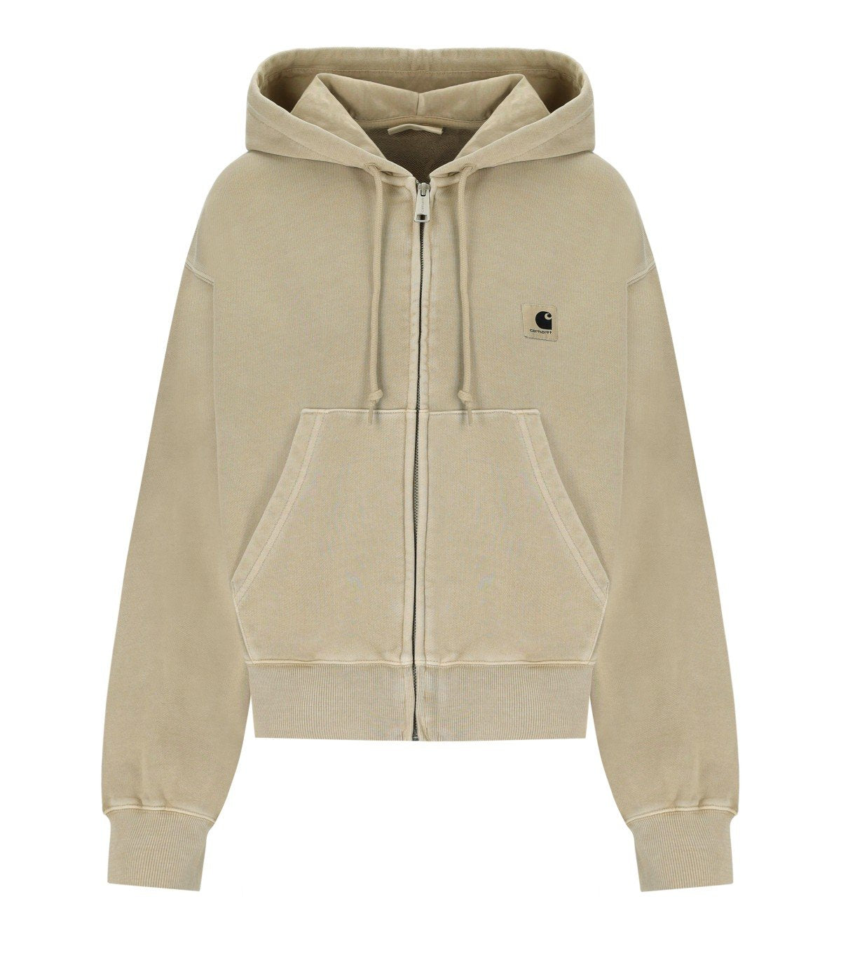 Sweatshirt mit Kapuze 'Nelson' von Carhartt Wip, gefertigt aus beigefarbenem, gewaschenem Baumwollstoff. Es hat einen Balloon Fit, Fronttaschen und das ikonische Logo-Patch, eine verstellbare Kapuze mit Kordelzug und einen Reißverschluss.