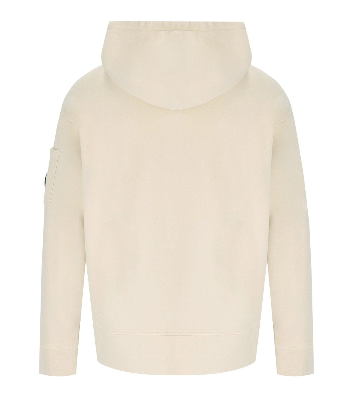 Hoodie von C.P. Company, gefertigt aus leicht angerauter Baumwolle in der Farbe Off-White, mit der ikonischen Tasche mit Linse am Ärmel. Verstellbare Kapuze mit Kordelzug und seitlichen Schlitzen, quadratischer Schnitt.