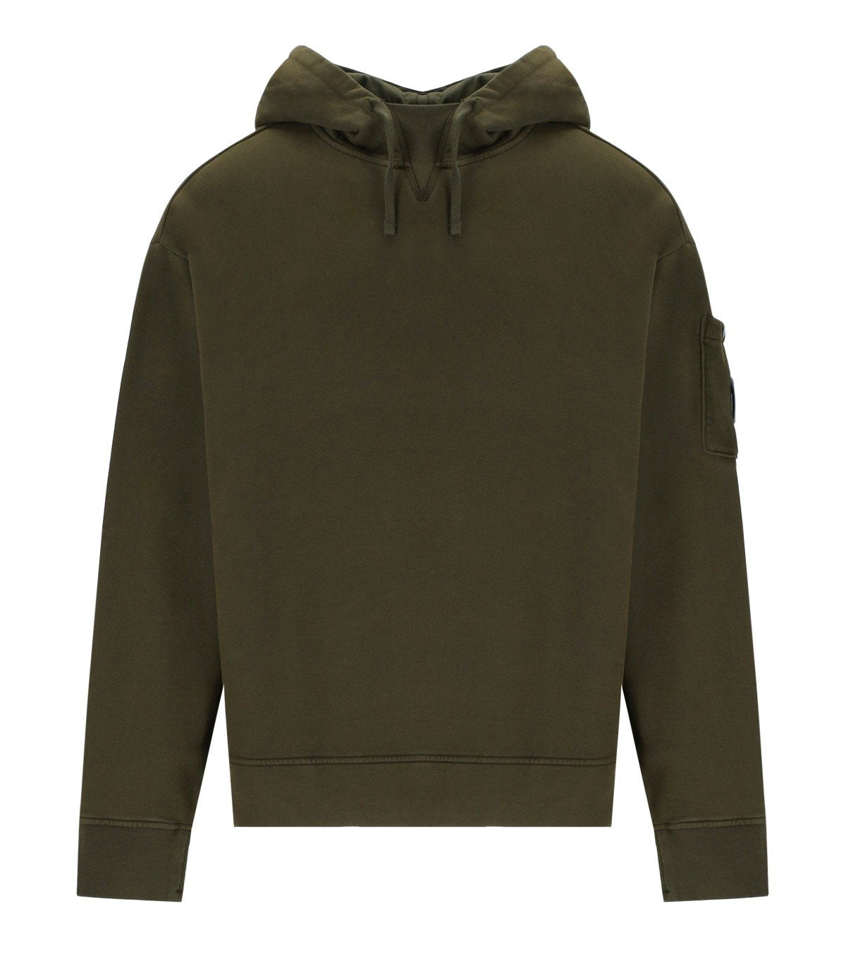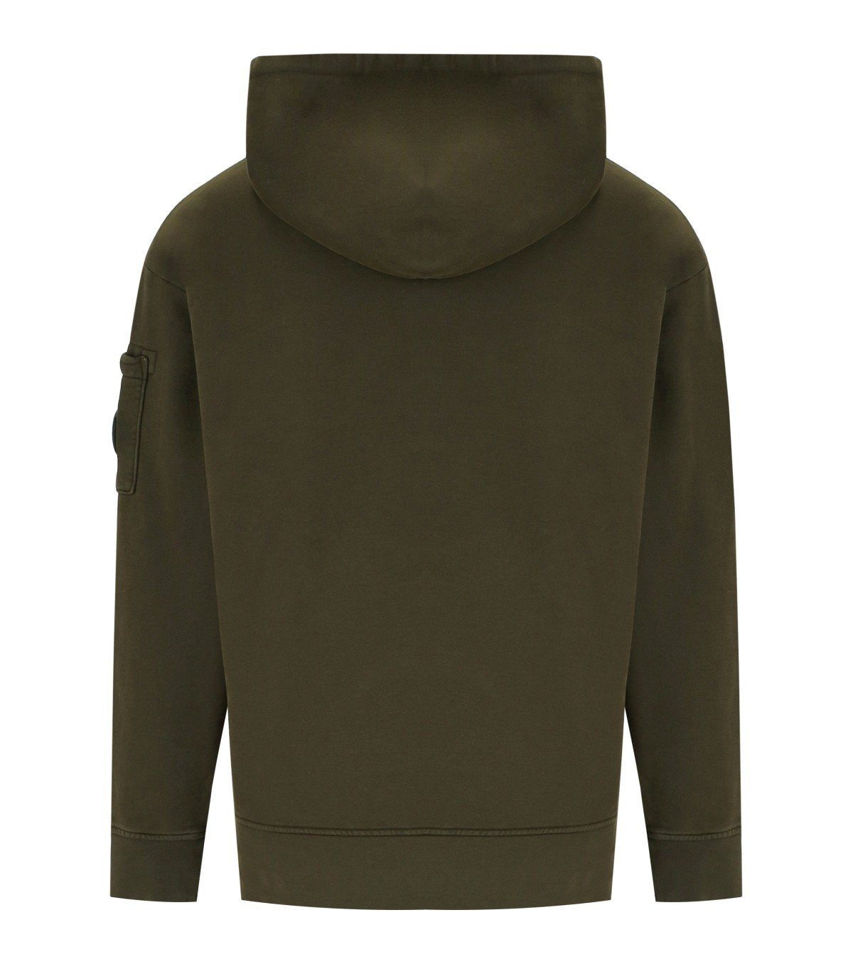 Hoodie von C.P. Company, gefertigt aus leicht angerauter Baumwolle in Militärgrün, mit verstellbarer Kapuze durch Kordelzug. Ikonische C.P.-Linse am Ärmel, seitliche Öffnungen und kastige Passform.