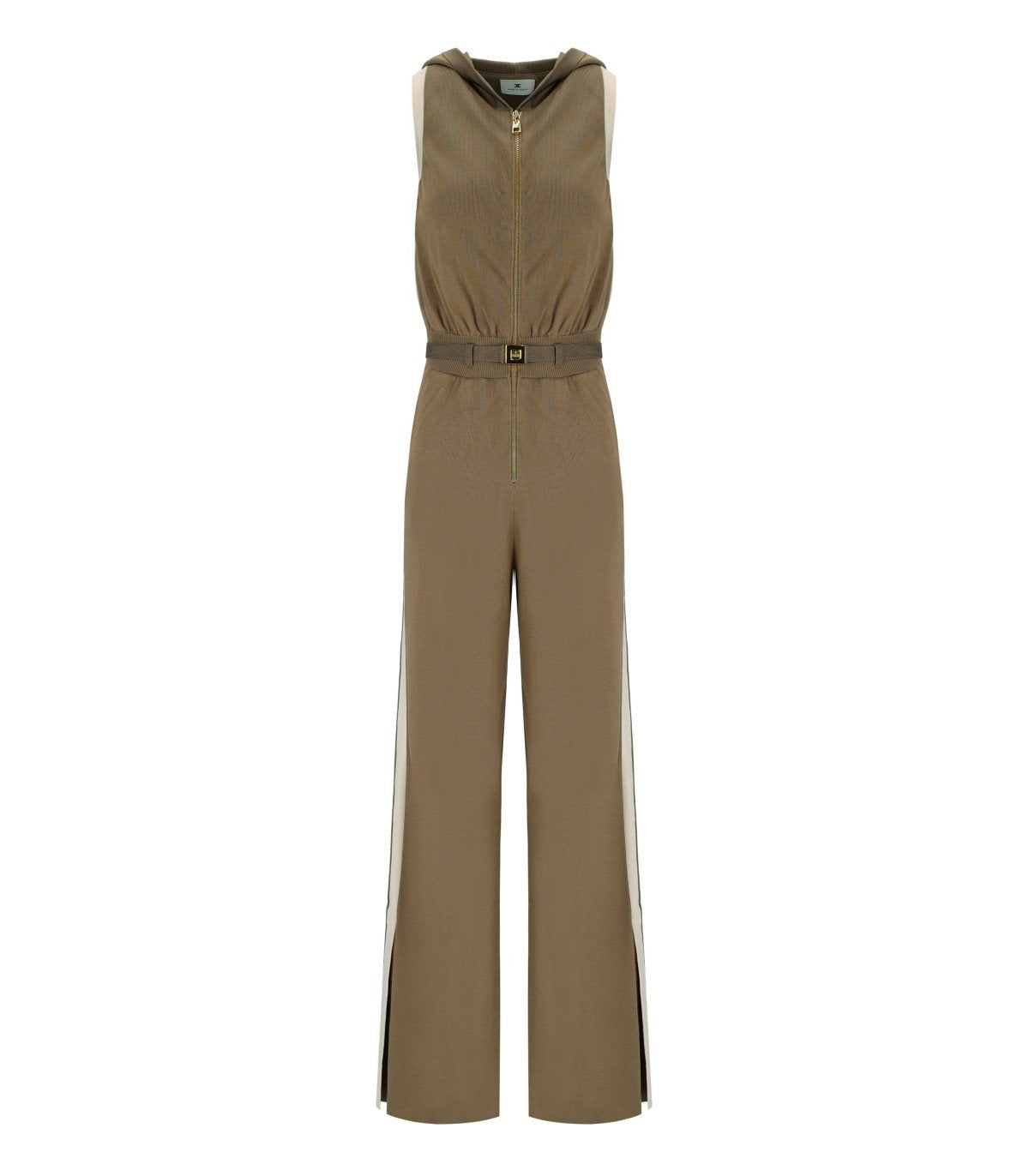 Elisabetta Franchi Jumpsuit aus einem beigen Viskose-Mischgarn. Mit Kapuze, goldfarbigem Reißverschluss und abnehmbarem Taillengürtel. Die Seiten sind mit kontrastierenden Bändern mit Jacquard-Logo sowie Schlitzen am Saum verziert. Reguläre Passform.