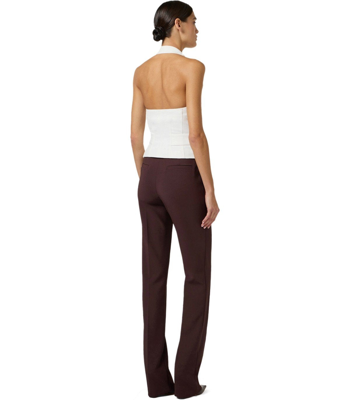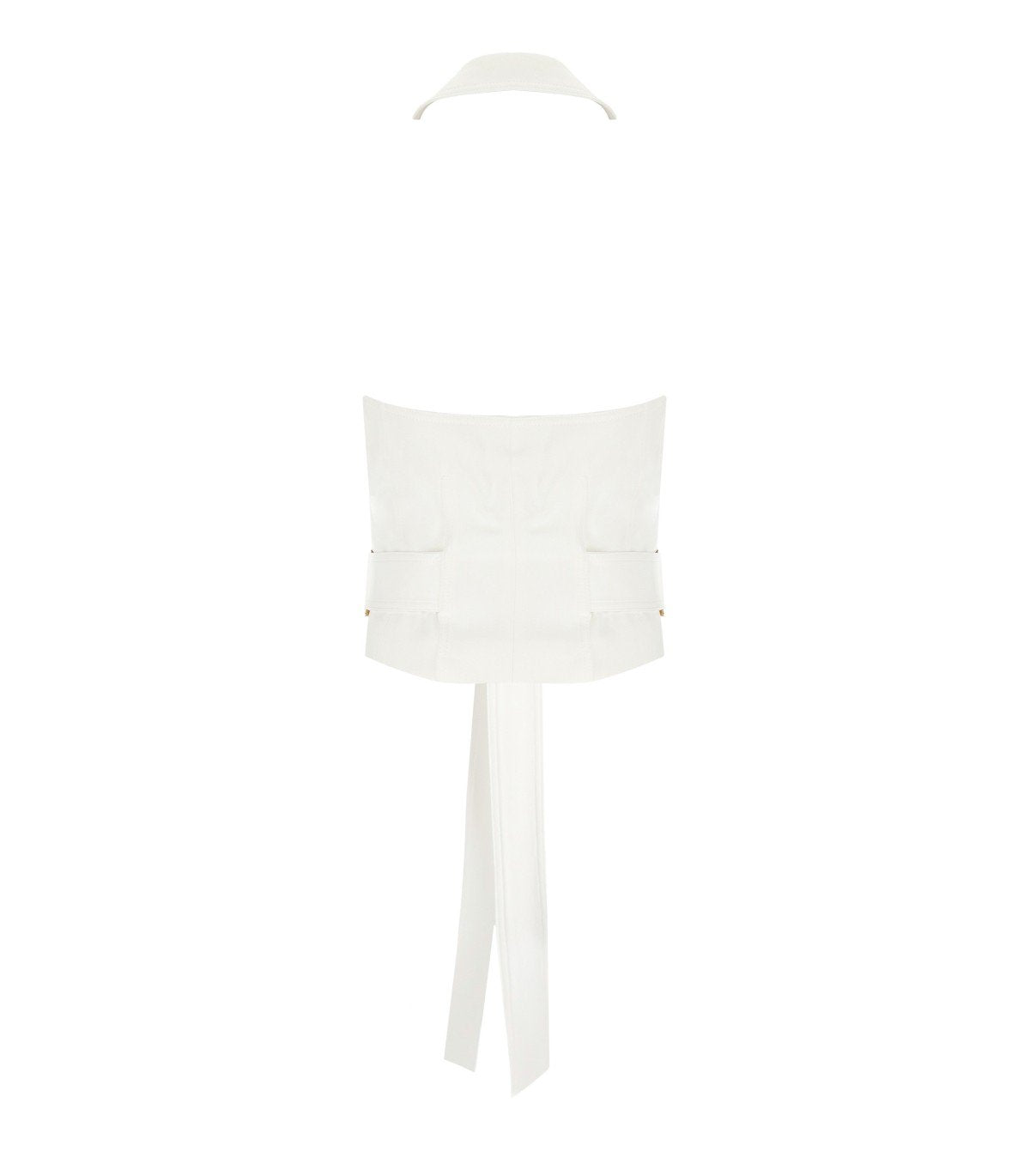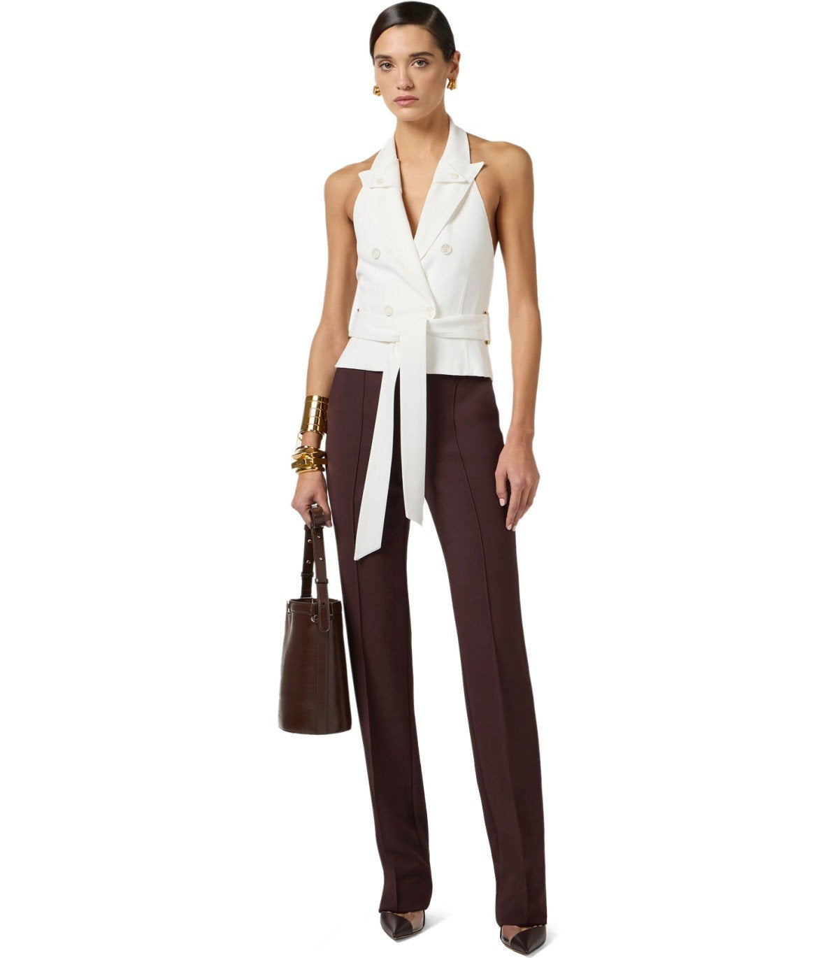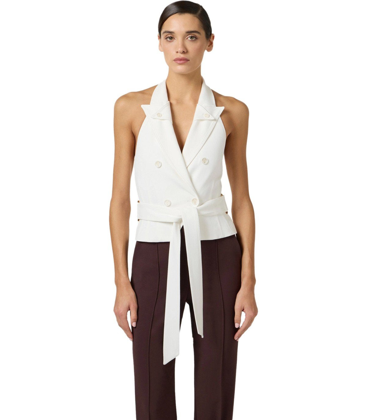 Elisabetta-Franchi-Weste aus elfenbeinfarbener Gabardine, mit Neckholder-Ausschnitt mit doppelten Revers und weit offenem Rücken. Doppelreihiger Knopfverschluss, ergänzt durch einen passenden Bindegürtel. Monogramm-Satinfutter. Schmale Passform.