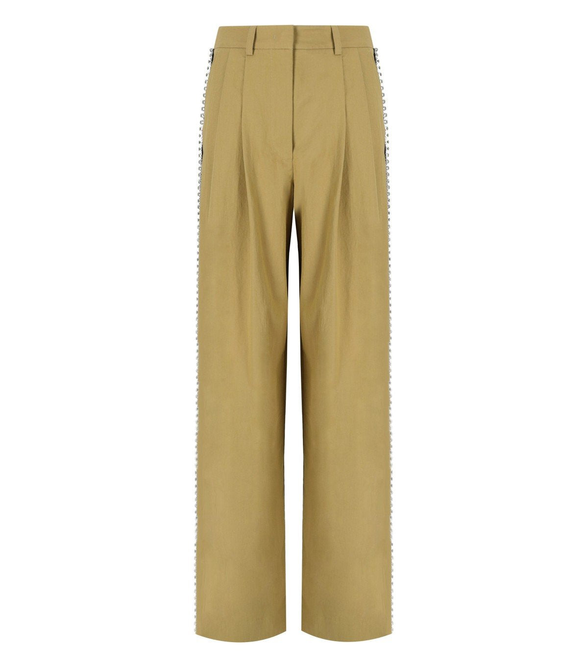 ISO-Hose von Essentiel Antwerp, gefertigt aus einer Baumwollmischung in Beigetönen. Sie hat einen weiten Schnitt, Gürtelschlaufen, französische Seitentaschen und einen Reißverschluss mit Metallhaken. An den Seiten ist sie mit schwarzen Stickereien und glänzenden Strasssteinen verziert. Lockerer Schnitt.