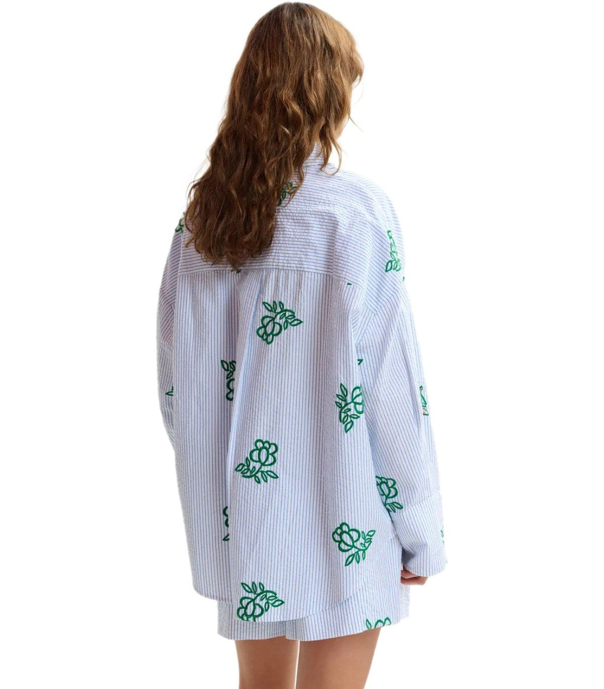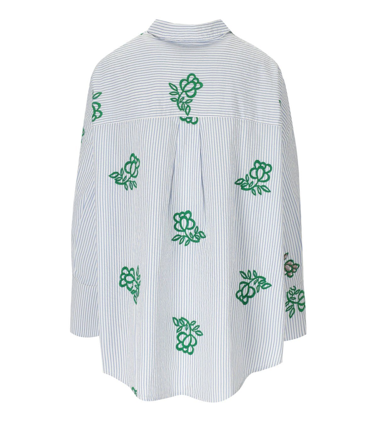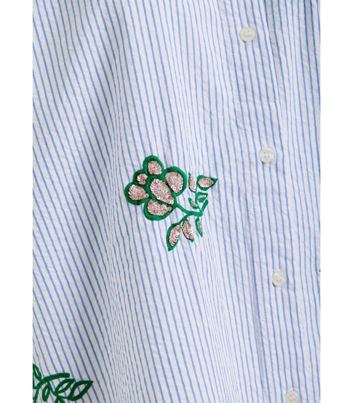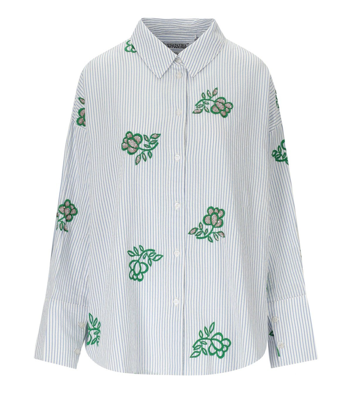 Jalinki-Hemd von Essentiel Antwerp aus weißer Baumwolle mit hellblauen vertikalen Streifen, verziert mit kontrastierender Blumenstickerei und Pailletten. Knopfverschluss. Oversize-Passform.