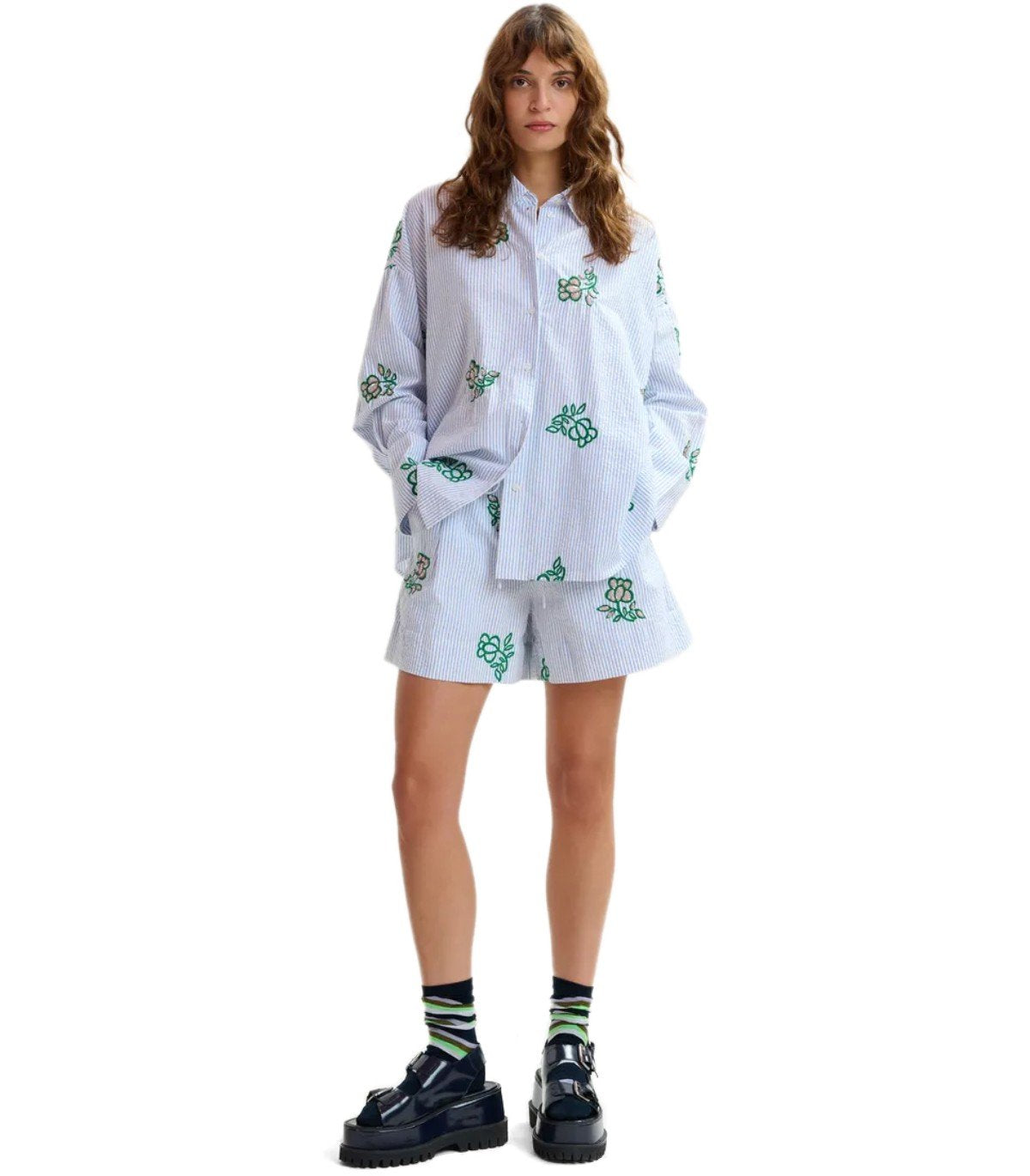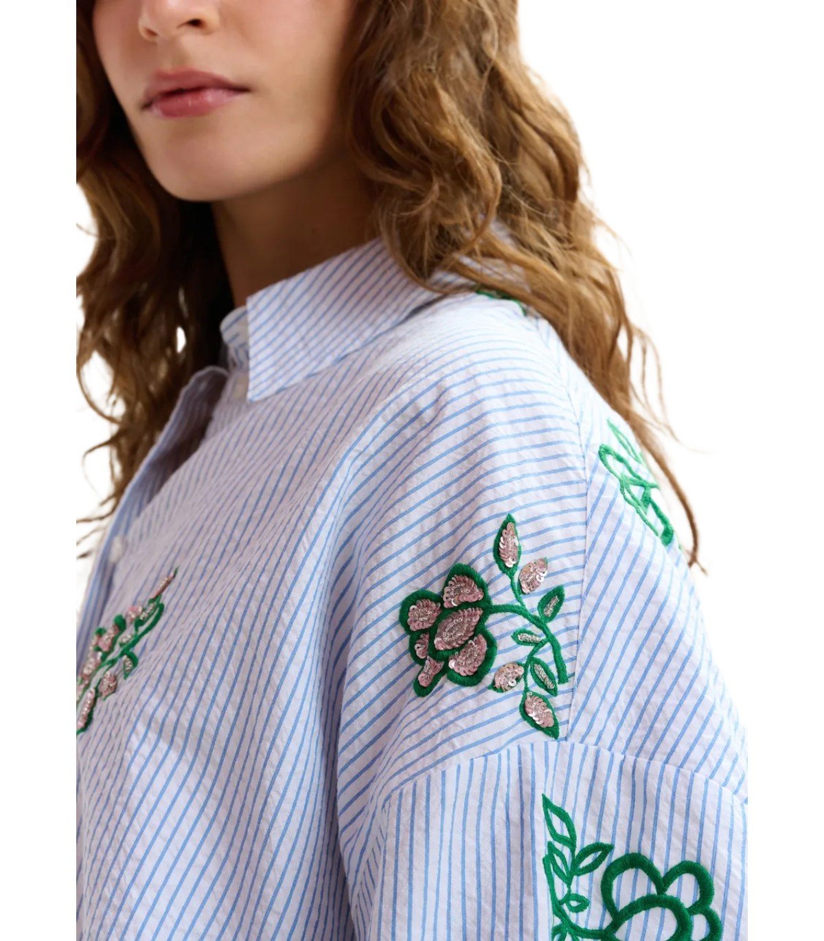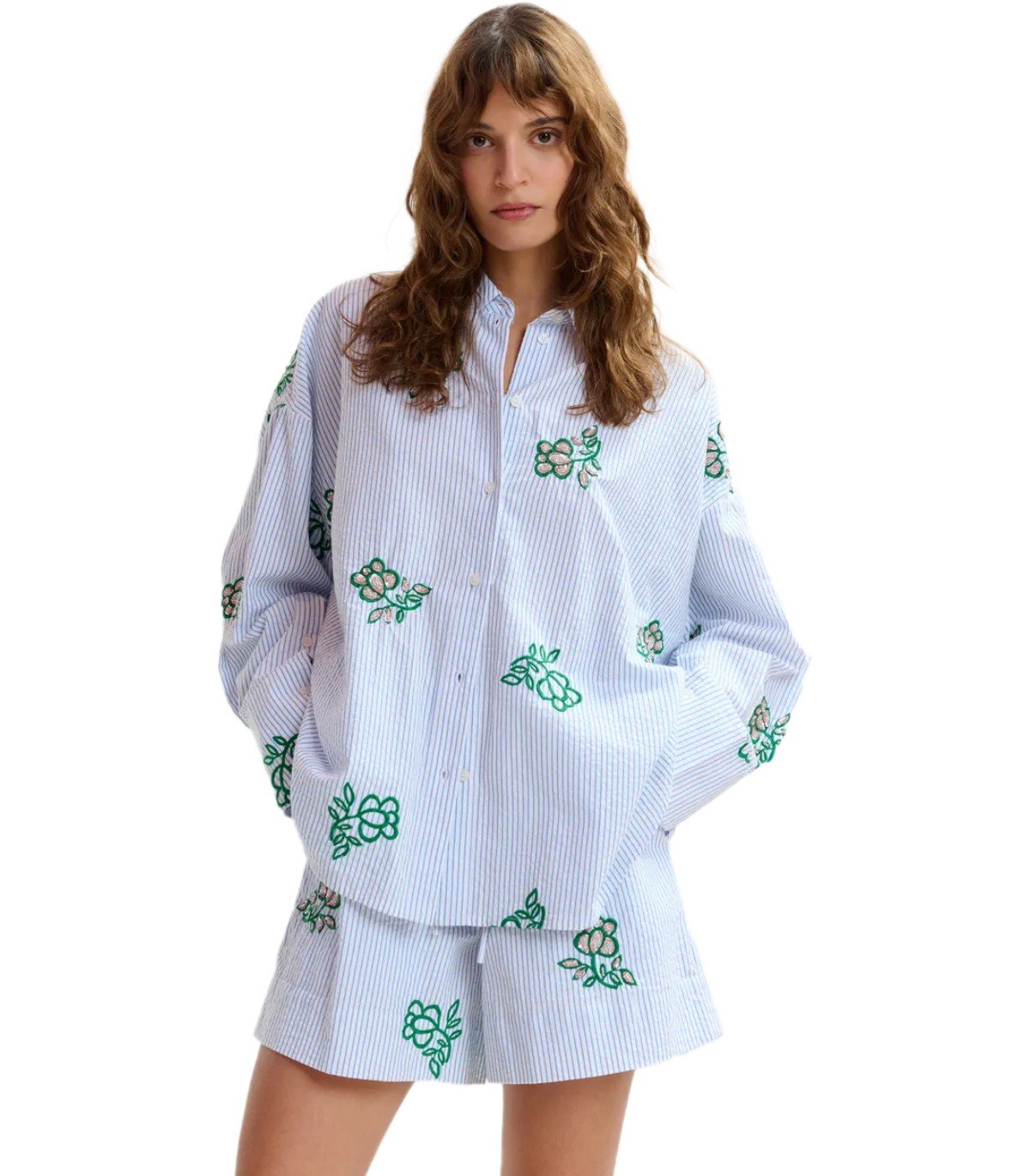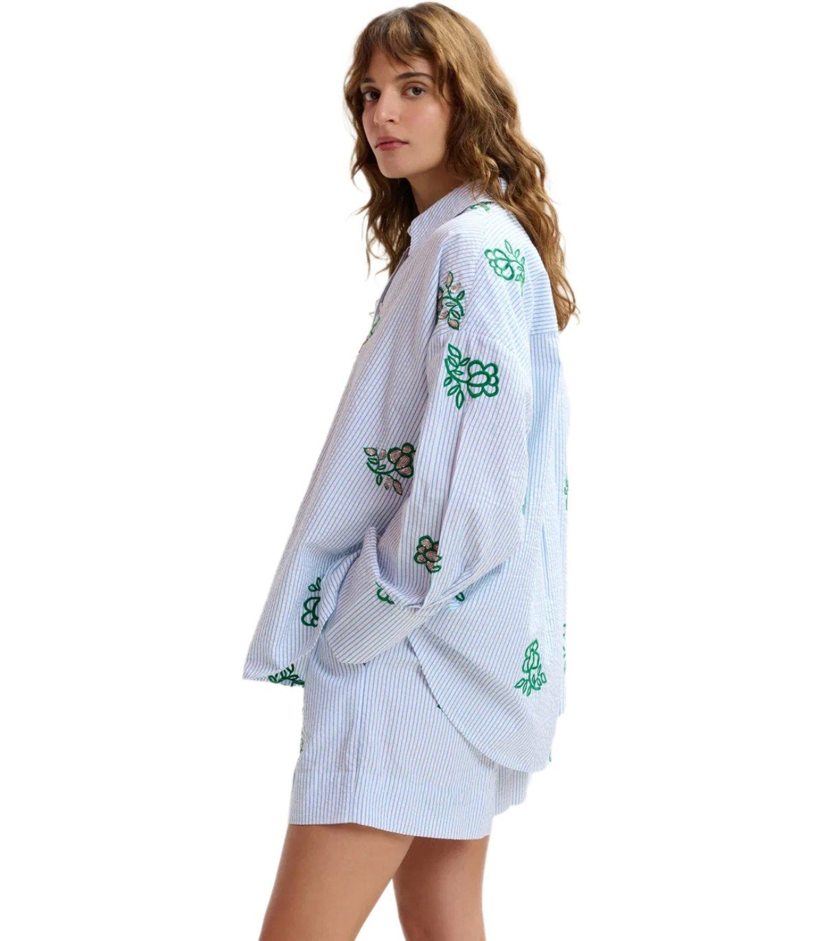 Jalinki-Hemd von Essentiel Antwerp aus weißer Baumwolle mit hellblauen vertikalen Streifen, verziert mit kontrastierender Blumenstickerei und Pailletten. Knopfverschluss. Oversize-Passform.