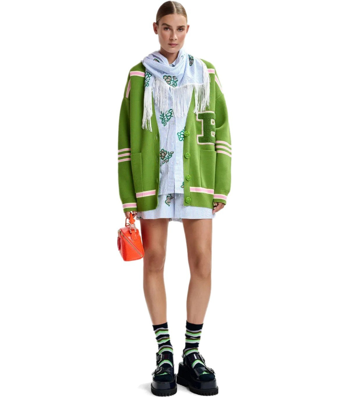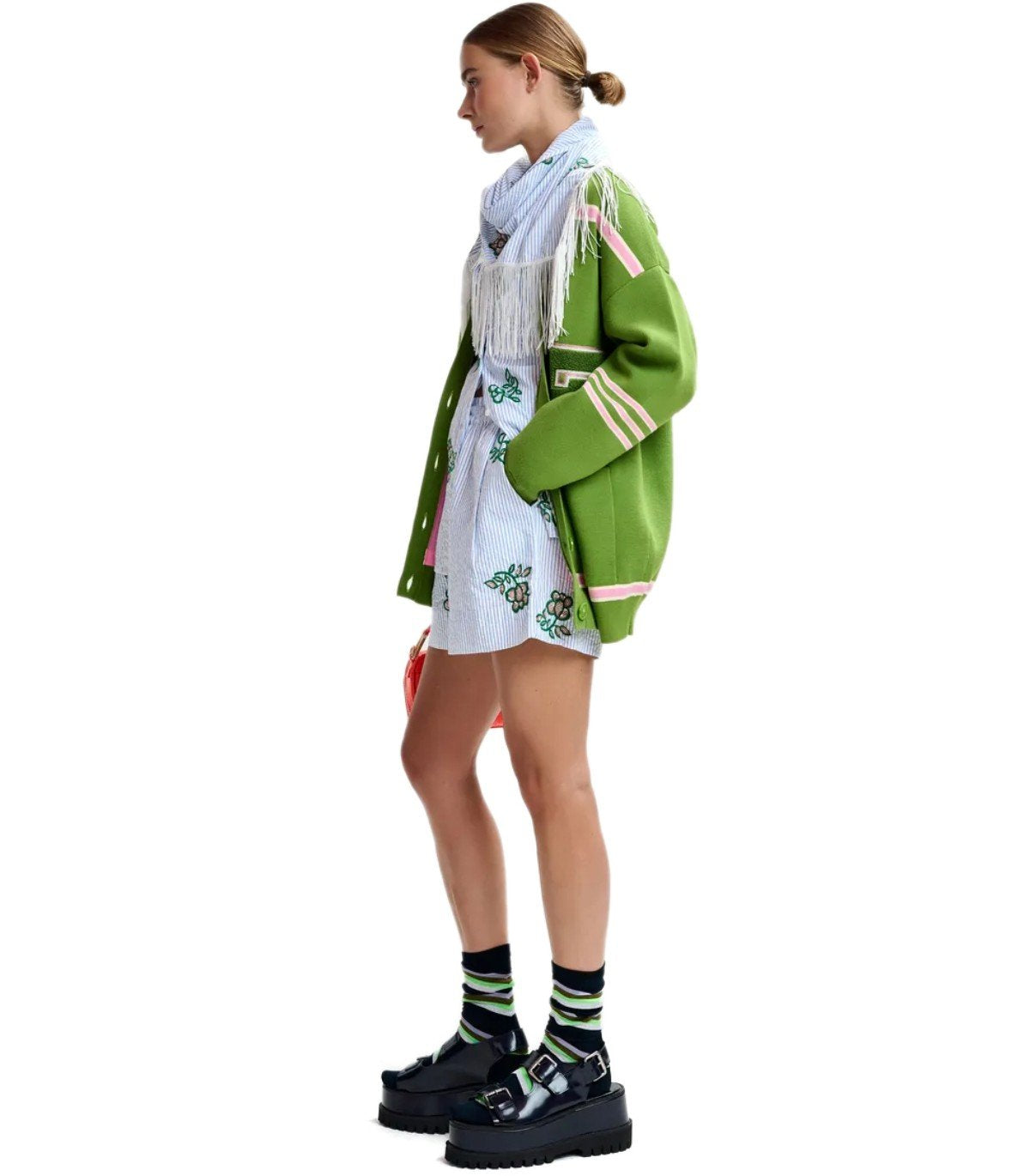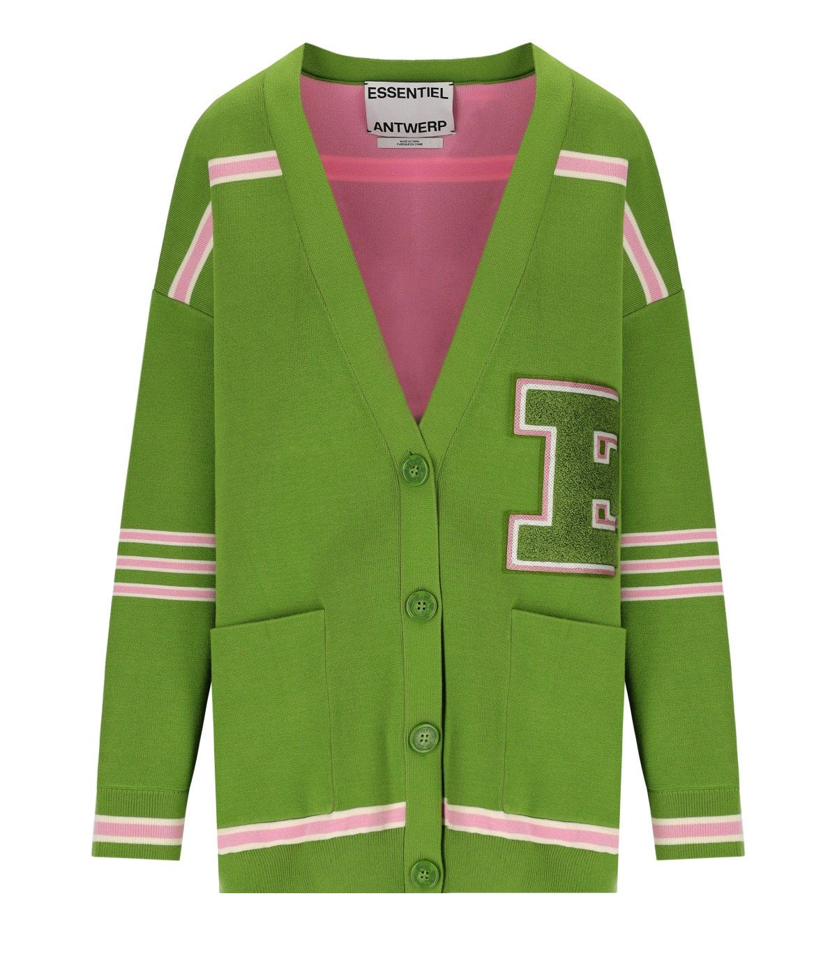 Essentiel Antwerp Cardigan aus einem recycelten Polyester-Mischgewebe in Grün- und Rosatönen. Mit Fronttaschen und einem übergroßen Chenille-Patch, tiefem V-Ausschnitt und Knopfverschluss. Oversized-Passform.