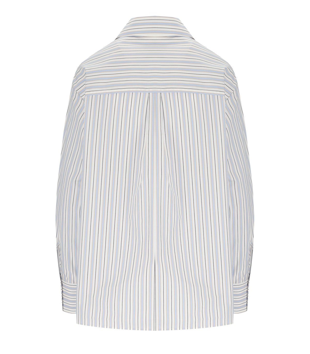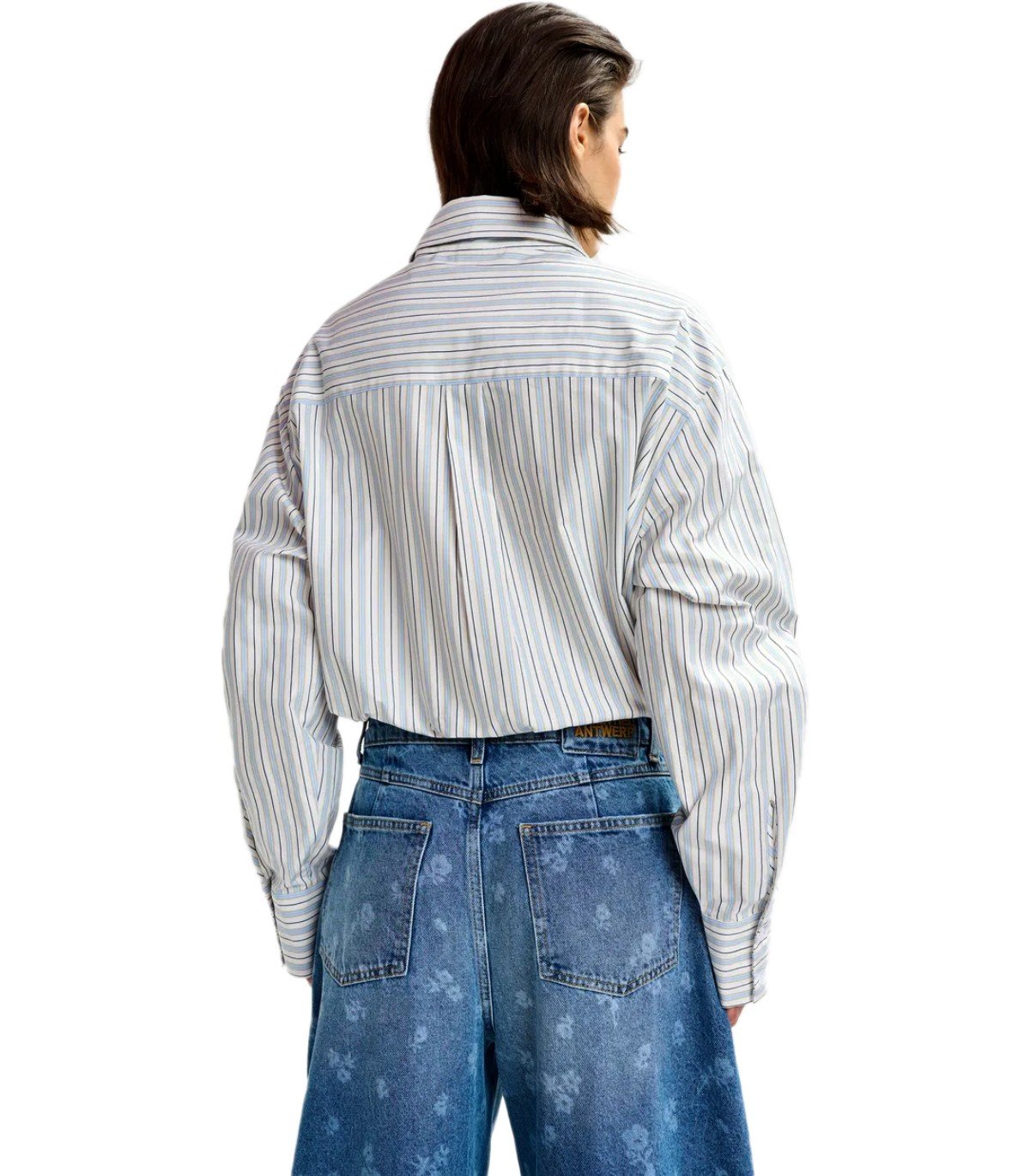 Jomato-Hemd von Essentiel Antwerp aus weißer Baumwolle mit vertikalen Streifen in Blau-, Hellblau- und Ockertönen. Oversize-Kragen, der gebunden werden kann und so einen stilvollen Akzent setzt, abgerundet mit goldfarbenen Schmuckknöpfen. Oversize-Passform.