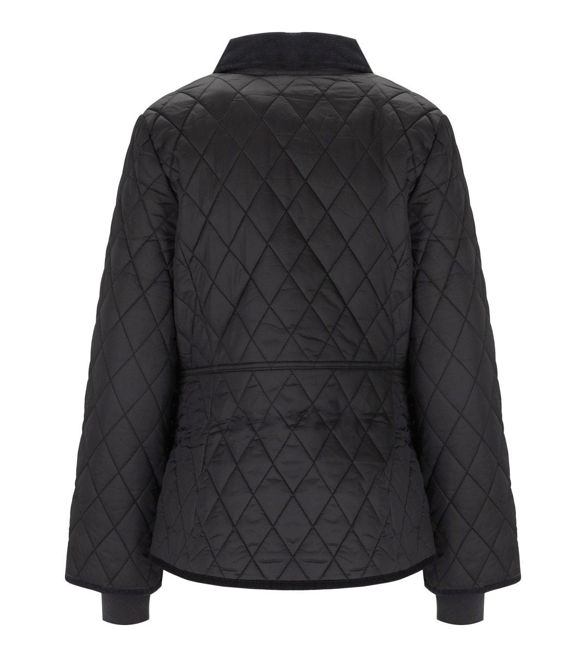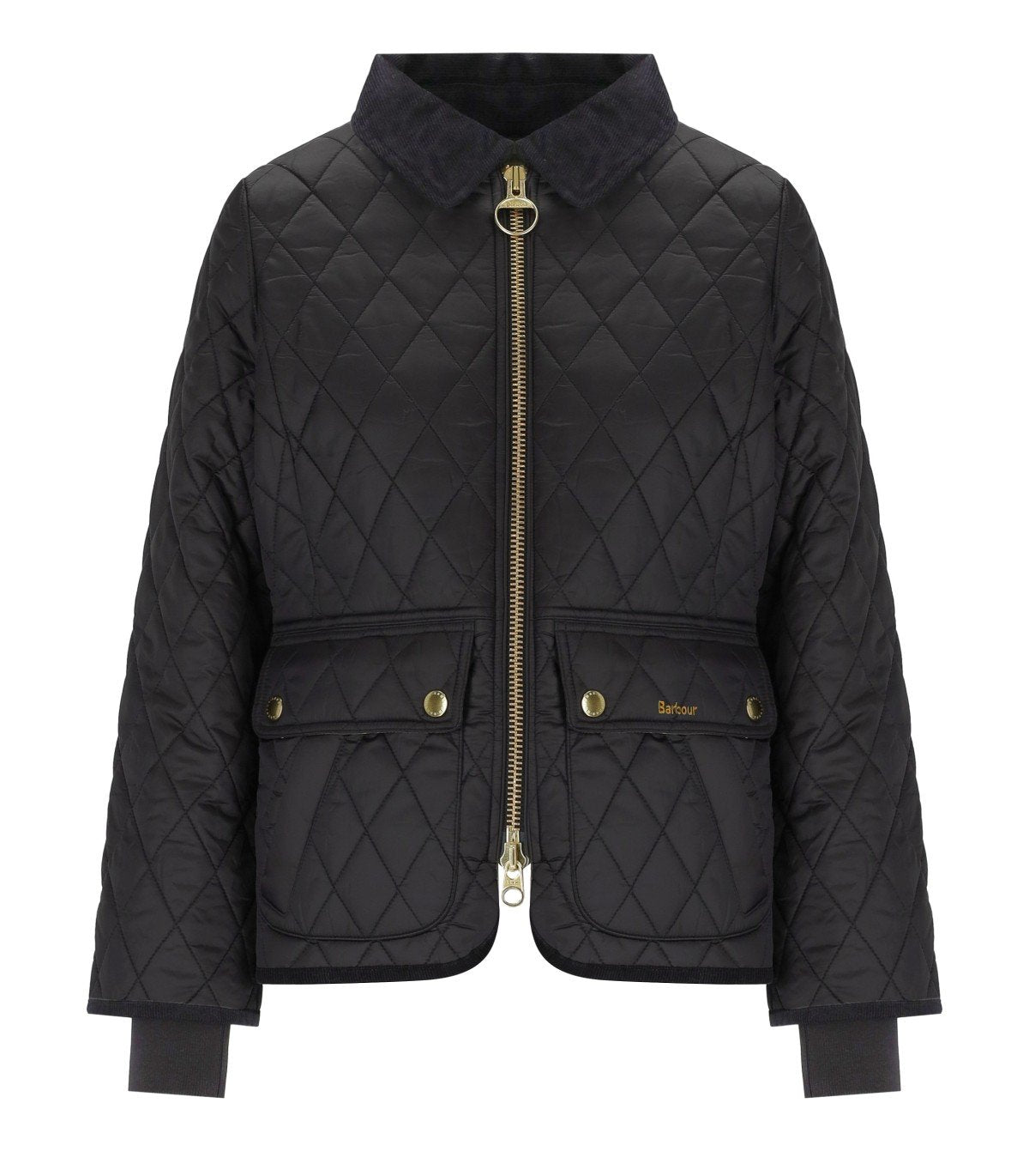 Barbour Beadnell Jacke aus Nylon mit gesteppter Optik in Schwarztönen. Sie verfügt über einen passenden Samtkragen, gerippte Bündchen und eine doppelte aufgesetzte Fronttasche mit gesticktem Logo, Markenknöpfen und eine zusätzliche Paspeltasche. Goldfarbener Markenreißverschluss. Reguläre Passform.