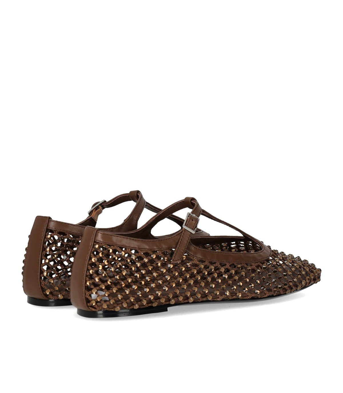 Ballerinas von Strategia aus Meshgewebe und Leder in Brauntönen, verziert mit ton-in-ton aufgesetzten Strasssteinen. Verstellbarer Knöchelriemen und Lederinnensohle. Ledersohle, Absatzhöhe 0,5 cm.