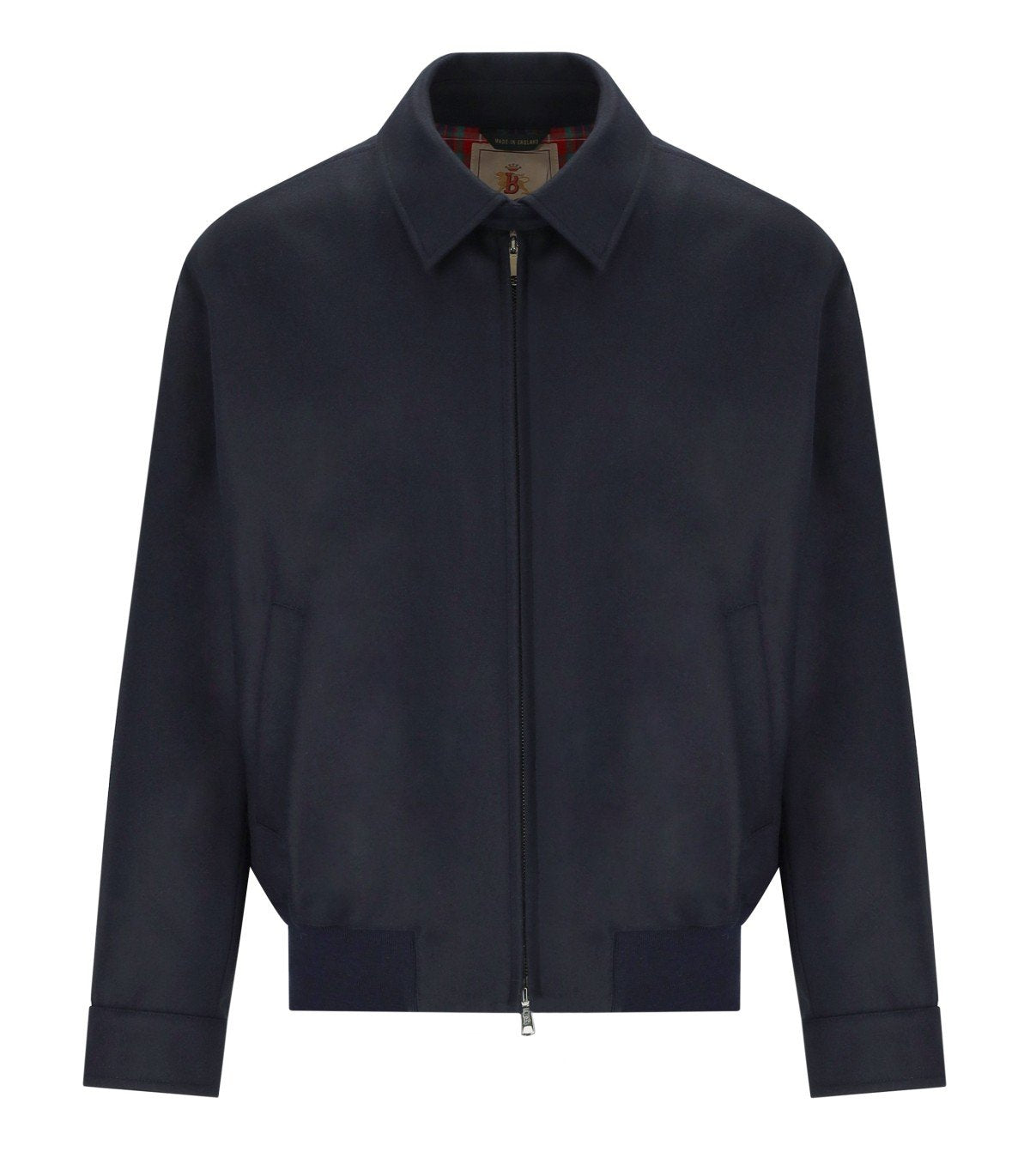 Baracuta G18 Melton Bomberjacke, gefertigt aus einer Mischung aus blauer Schurwolle, verfügt über einen geknöpften Kragen und geknöpfte Ärmelbündchen. Sie ist mit paspelierten Taschen auf der Vorderseite, einem ikonischen roten Tartan-Innenfutter und einem Zwei-Wege-Reißverschluss ausgestattet. Reguläre Passform.