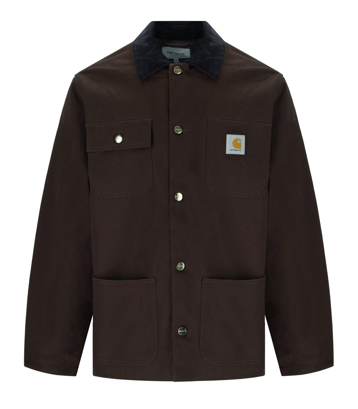 Michigan-Jacke von Carhartt Wip, gefertigt aus wasserabweisendem braunem Baumwoll-Canvas. Gefüttert mit einer Mischung aus Wolle und Nylon, verfügt sie über Fronttaschen und das ikonische Logo-Patch. Kragen aus Cord und verstellbare Ärmelbündchen. Frontverschluss mit Knöpfen. Reguläre Passform.