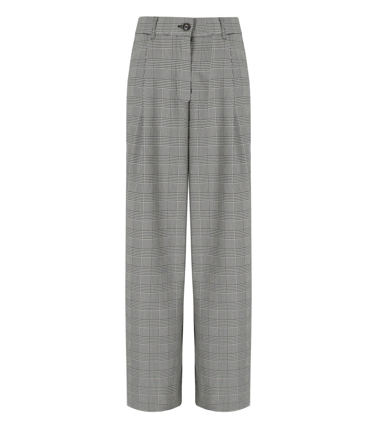 Invest-Hose von Essentiel Antwerp, gefertigt aus einem Viskose-Mix mit einem Prince-of-Wales-Karomuster in Grautönen. Sie verfügt über eine hohe Taille und ein weites Bein sowie italienische Taschen, Gürtelschlaufen und einen Verschluss mit Knopf und Reißverschluss. Lockerer Schnitt.