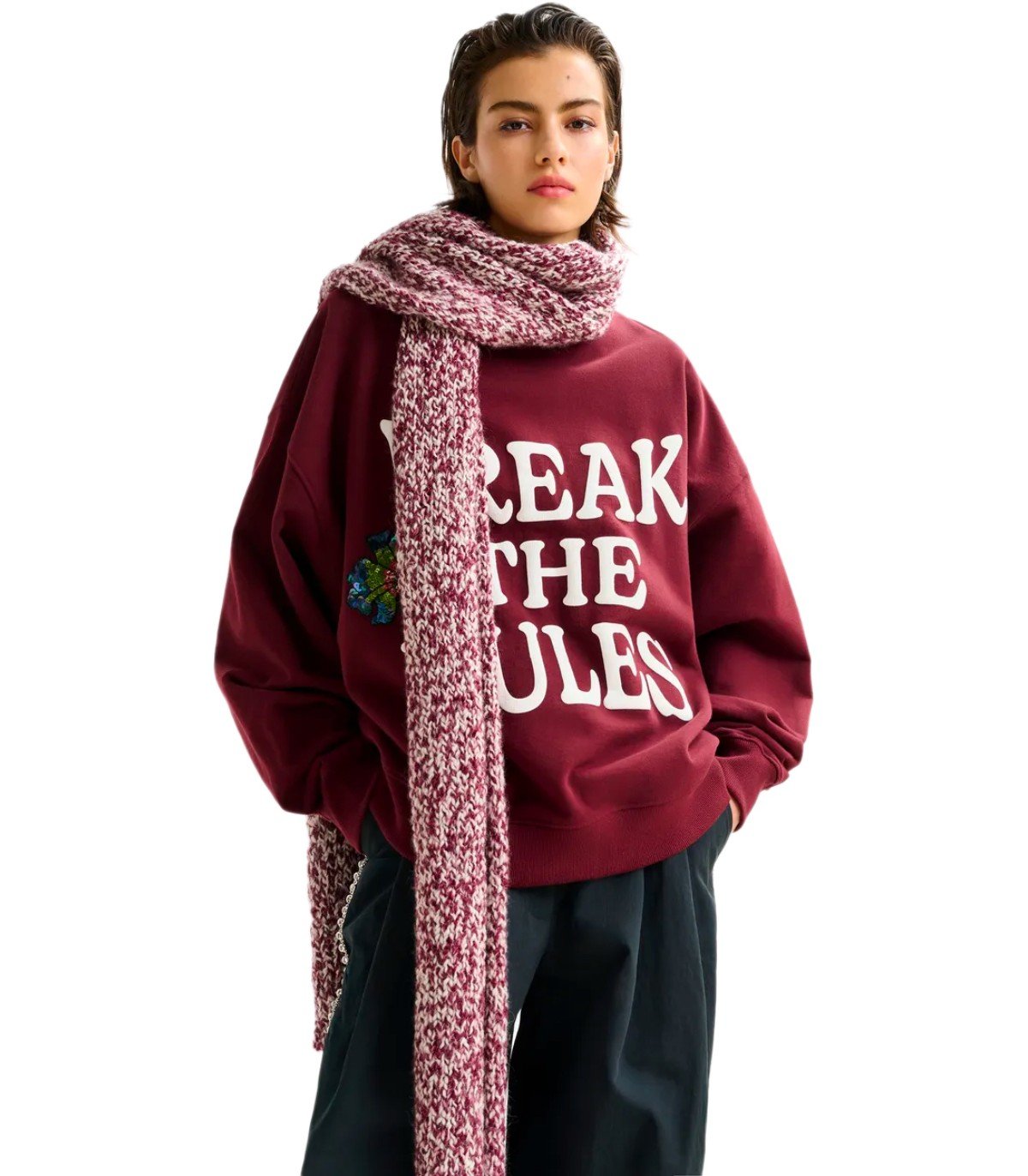 Essentiel Antwerp Itourmaline Schal aus einer Wollmischung in Burgunderrot und Weiß. Er verfügt über gerippte Kanten und ein aufgesticktes Markenlabel. Maße: 250 x 30 cm.