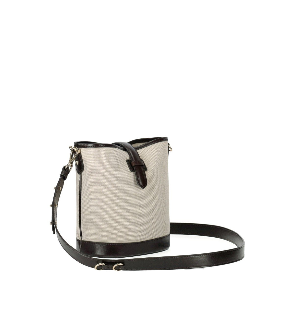 Weekend Max Mara Vasaio Beuteltasche aus Baumwoll-Canvas in Beigetönen mit dunkelbraunen Lederdetails. Ungefüttert, mit einer vorderen Schlaufen- und Riemenverschluss. Innen verfügt sie über eine Aufbewahrungstasche mit Druckknopfverschluss. Die Tasche zeichnet sich durch eine ovale Form aus und wird mit zwei austauschbaren Schulterriemen geliefert: einem breiten braunen Lederriemen sowie einem Riemen mit einem Band, das die Weekend Max Mara Jacquard-Schriftzüge trägt; beide sind verstellbar und abnehmbar. Maße: 21 x 16,5 x 12,5 cm.