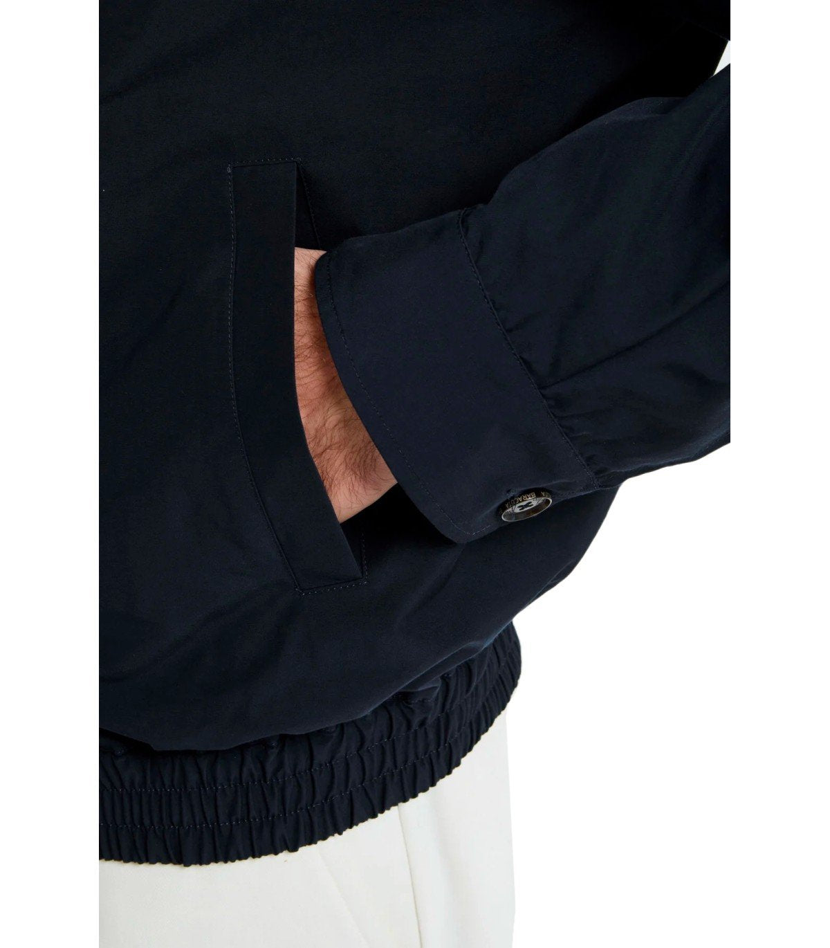 Baracuta G18 bomber jacket made of Baracuta Cloth, a navy blue cotton-polyester blend. It features front welt pockets and a two-way zip closure. Buttoned collar and cuffs, tartan cotton lining, and an elasticated hem. Regular fit.