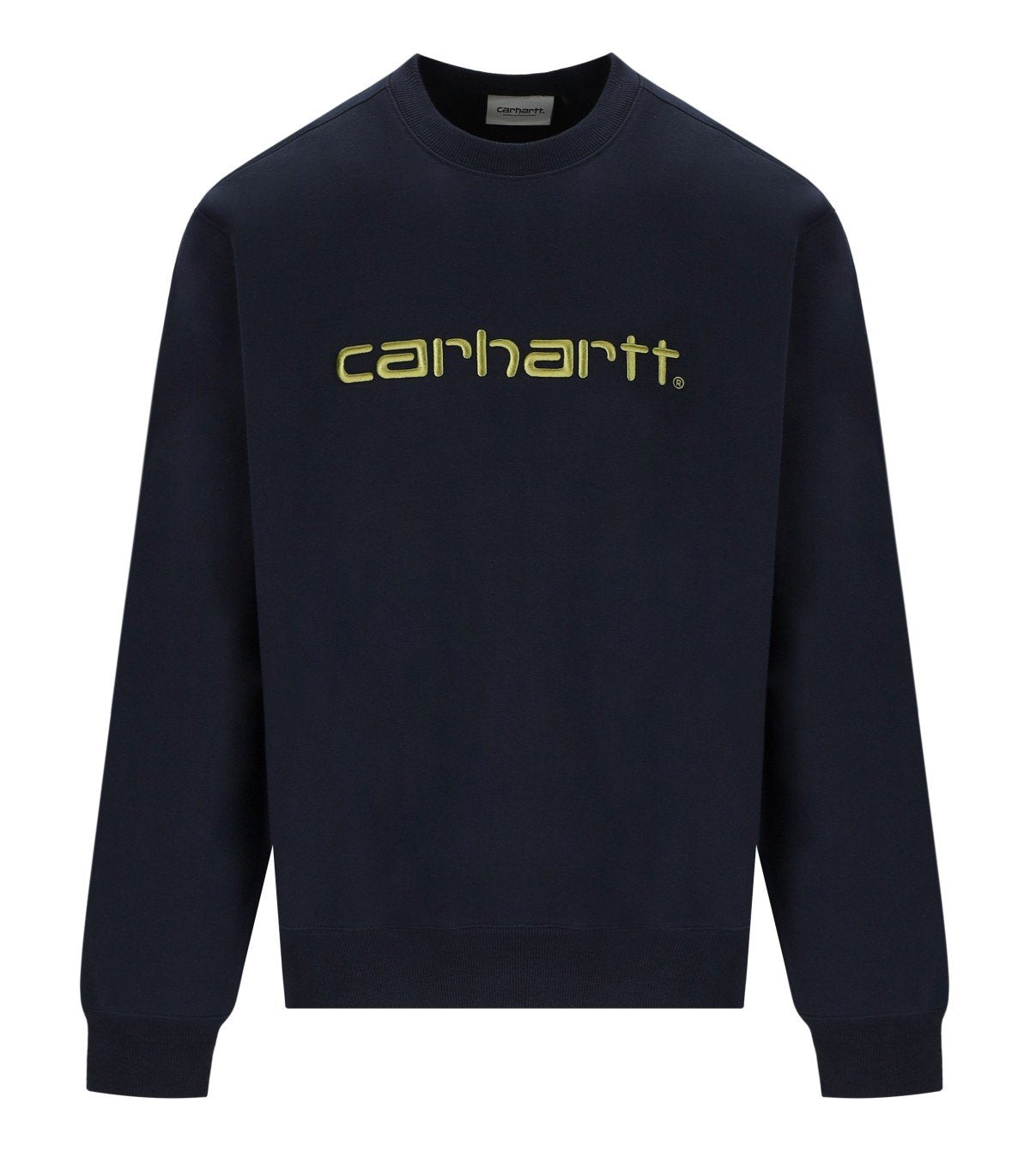 Carhartt WIP sweatshirt made from a cotton blend in midnight blue. It features a ribbed collar, cuffs, and hem. It features an embroidered logo on the chest in shades of green. Loose fit.