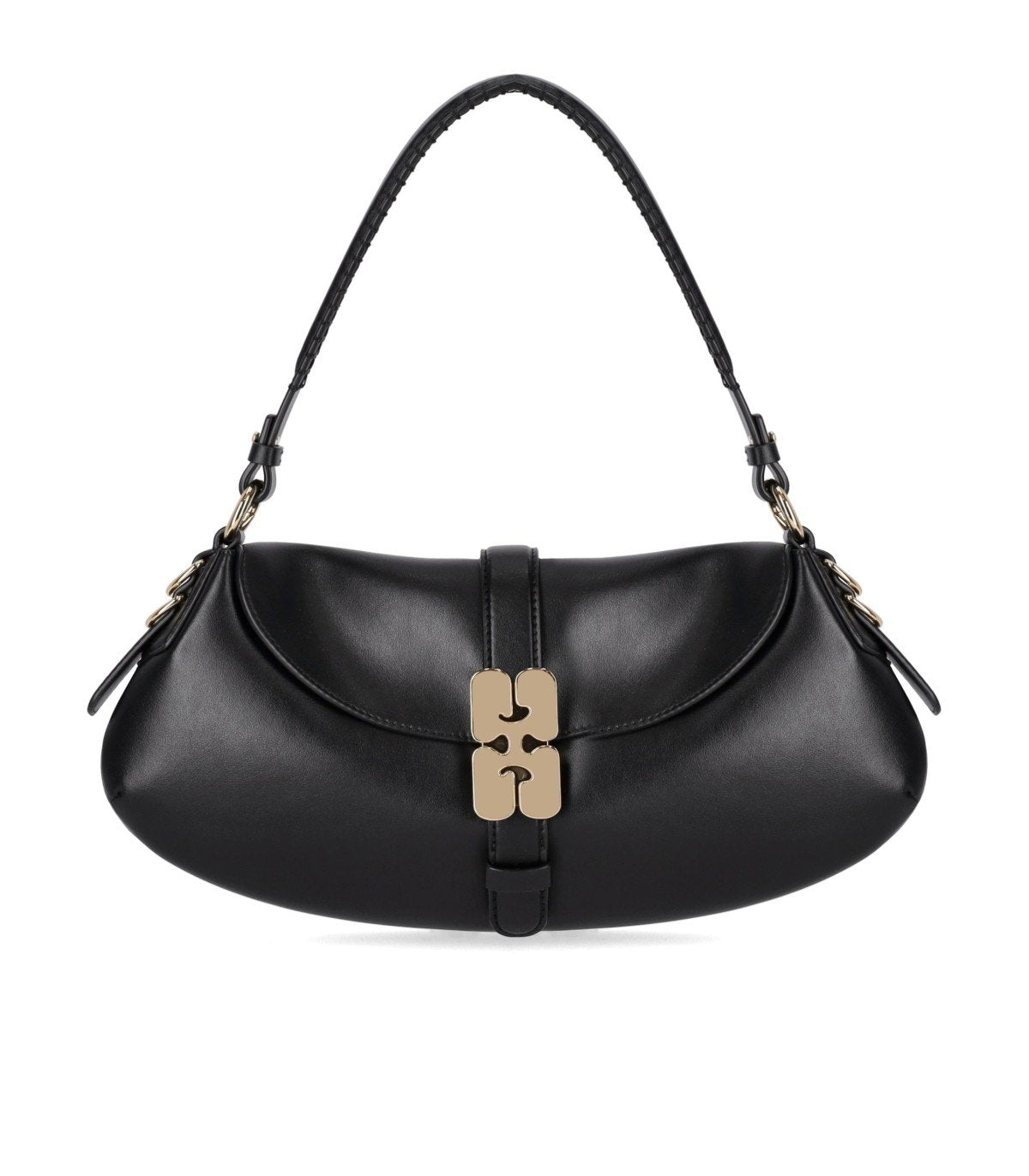 Ganni Kat bag made of eco-leather and polyester in black tones. It features a curved shape and a matching eco-leather buckle closure. Embellished with a large gold-tone metal butterfly logo on the front. Inside, it has a single compartment and a pocket with a branded label. Dimensions: 36 x 18 x 4 cm.