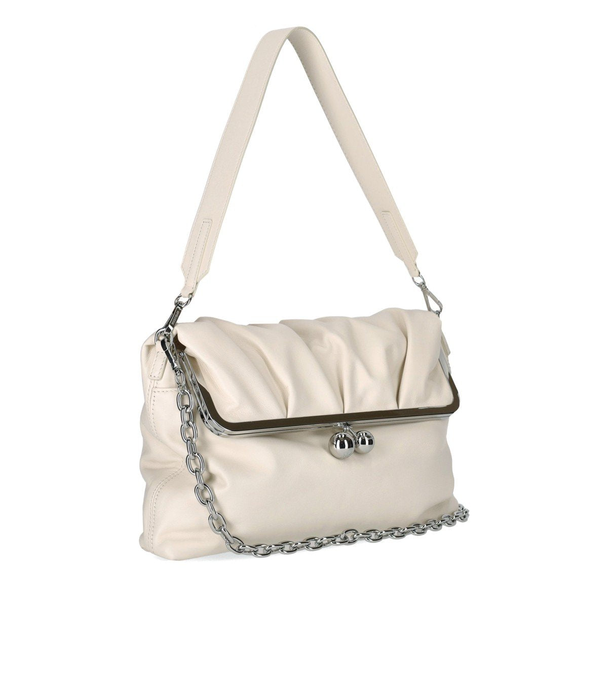 Max Mara Weekend Pasticcino Slalom bag, crafted from soft cream-white leather. Features a magnetic closure and silver-tone metal logoed spheres. Equipped with two shoulder straps—one chain and one leather—removable. Lined, with a single internal compartment. Dimensions: 36 × 24 × 5 cm.