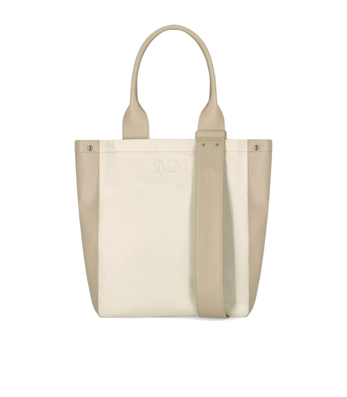 MM Max Mara Pesco bag made of cotton in beige tones, with inserts and double handles in synthetic leather. Features snap buttons that allow the accessory’s capacity to be increased. Enhanced with an embossed MM logo on the front and a beige synthetic-leather buckle. Lined, with an internal zip pocket and a branded label. Dimensions: 32 x 38 x 13 cm.