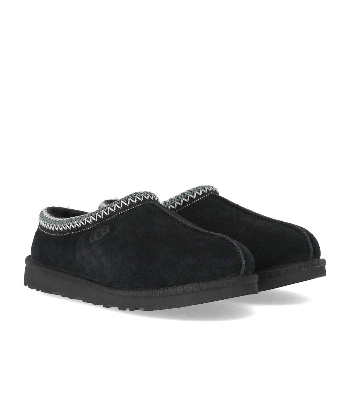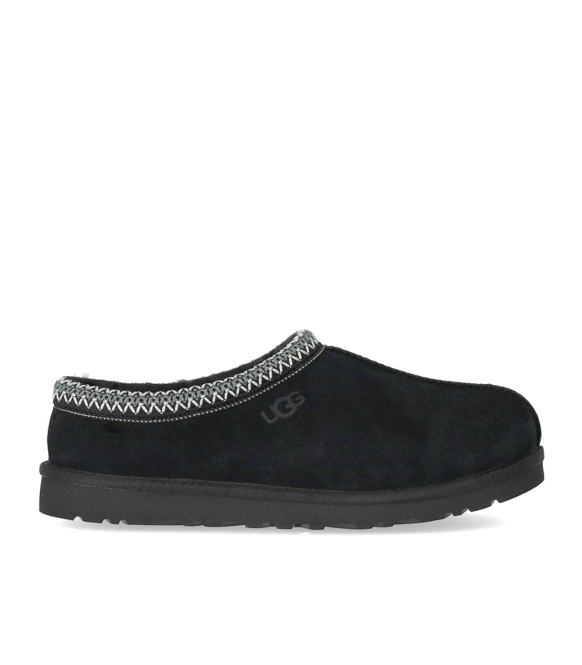 Tasman slipper by Ugg made of suede leather in shades of black. It features an embroidered trim in shades of gray and white. Lining and branded insole in UggPlush™, a regenerated wool blend with lyocell. Ugg logo on the side of the upper and tone-on-tone rubber sole. Height: 2 cm.