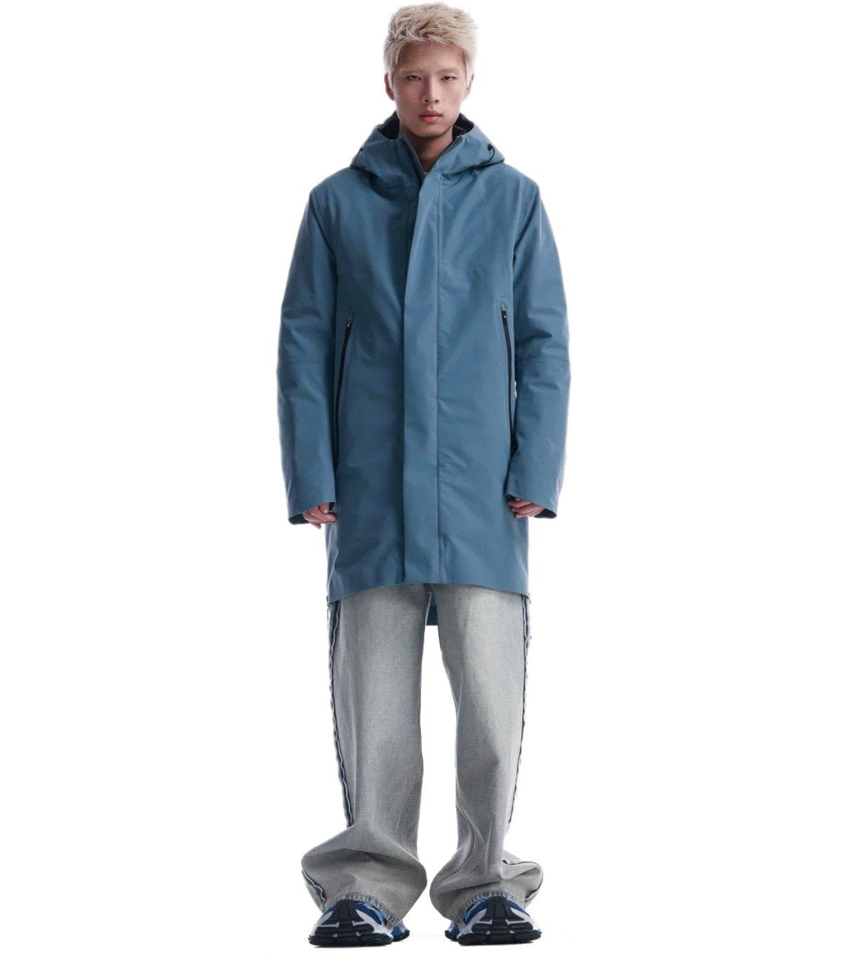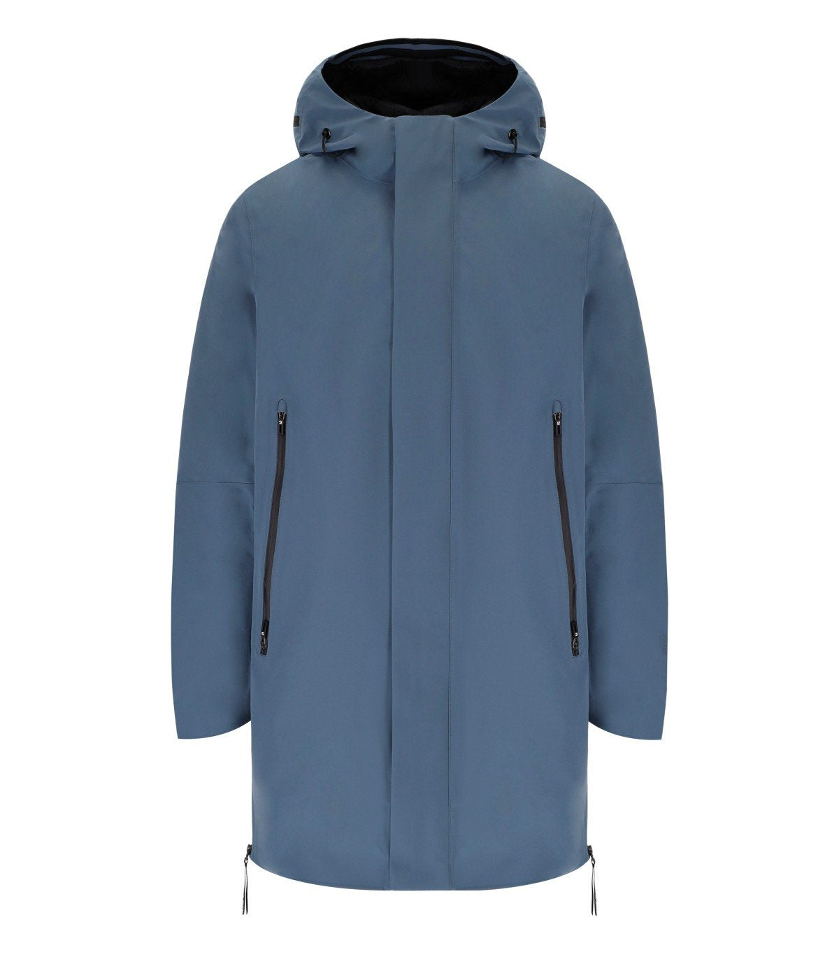 Krakatau Parka Planck 3-in-1 is crafted from nylon in shades of blue. It features an adjustable hood with drawstring and zipper, also equipped with a reinforced visor. The removable inner jacket can also be worn on its own. It has a front closure with a two-way zip and automatic magnetic buttons. There are zippered pockets on the front with an additional small compartment inside. It is characterized by zipped side vents and sleeves with a silicone branded trim. Smart pocket on the sleeve. Taped seams. Regular fit.