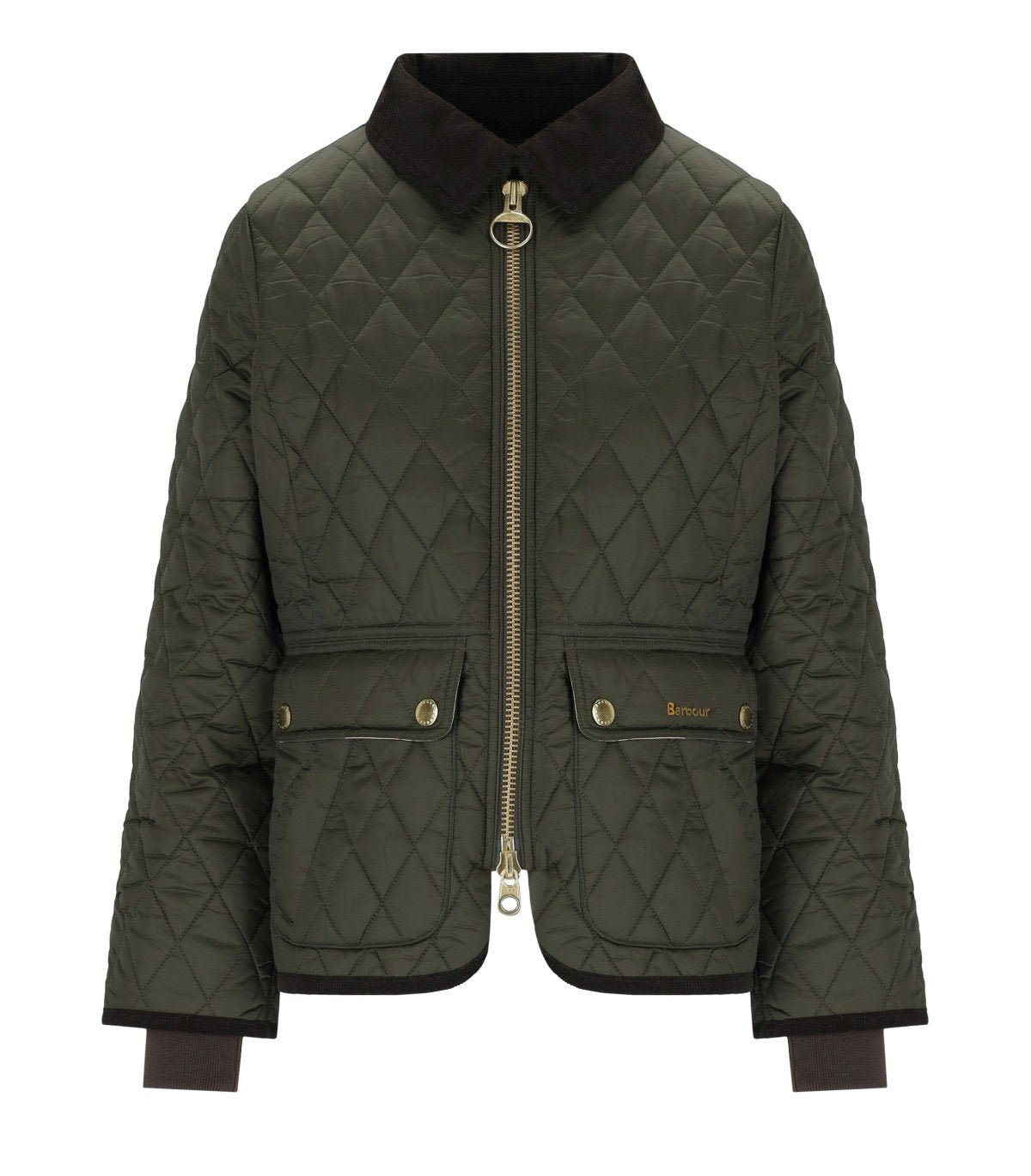 Barbour Beadnell jacket made of green nylon with diamond quilting. Brown corduroy collar, ribbed cuffs, and double patch pockets on the front with embroidered logo. Closure with gold-tone metal logo zipper. Regular fit.
