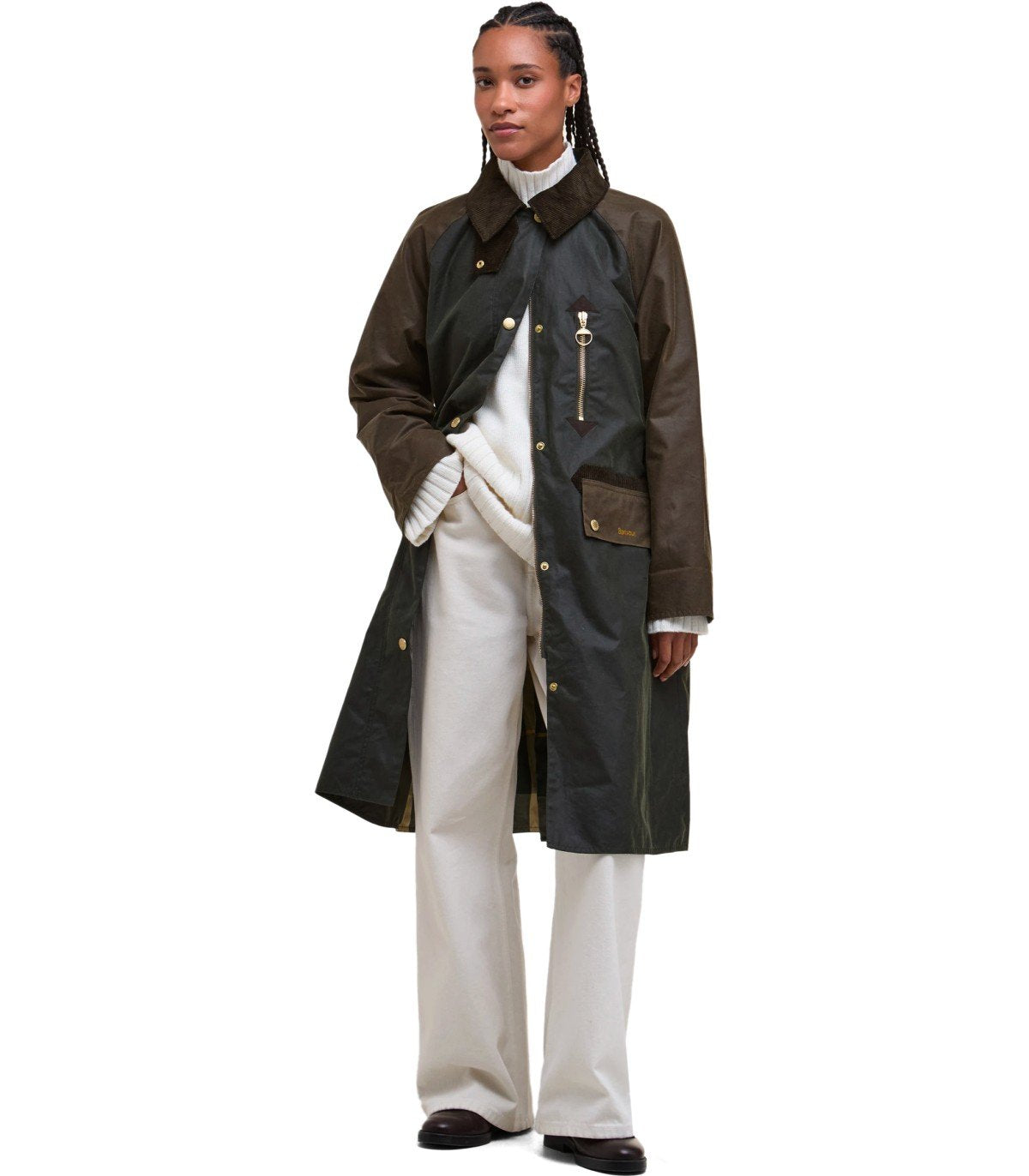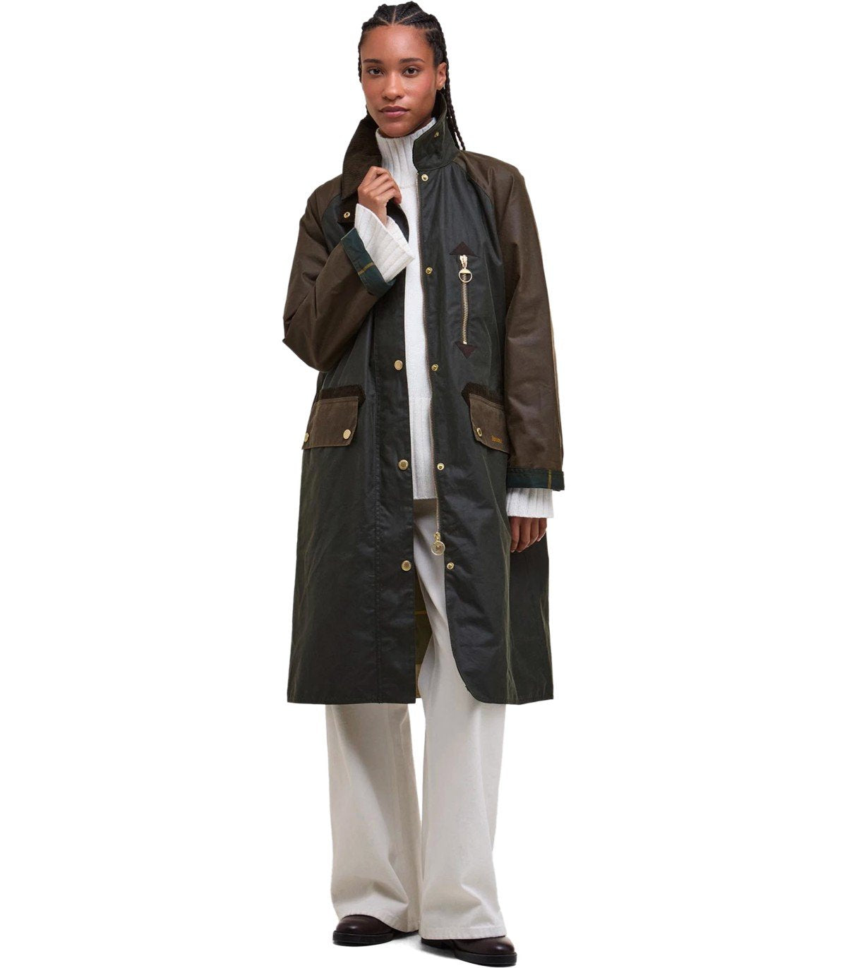Barbour Evette jacket is crafted from waxed cotton in two shades of green. Enhanced by a brown ribbed velvet collar and trims, it features dual patch pockets on the front, one of which is branded, and a closure with a zip and branded snap buttons. The jacket has a tartan lining and a map pocket with a gold-tone branded zip. Relaxed fit.