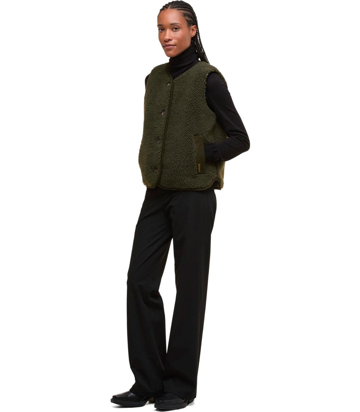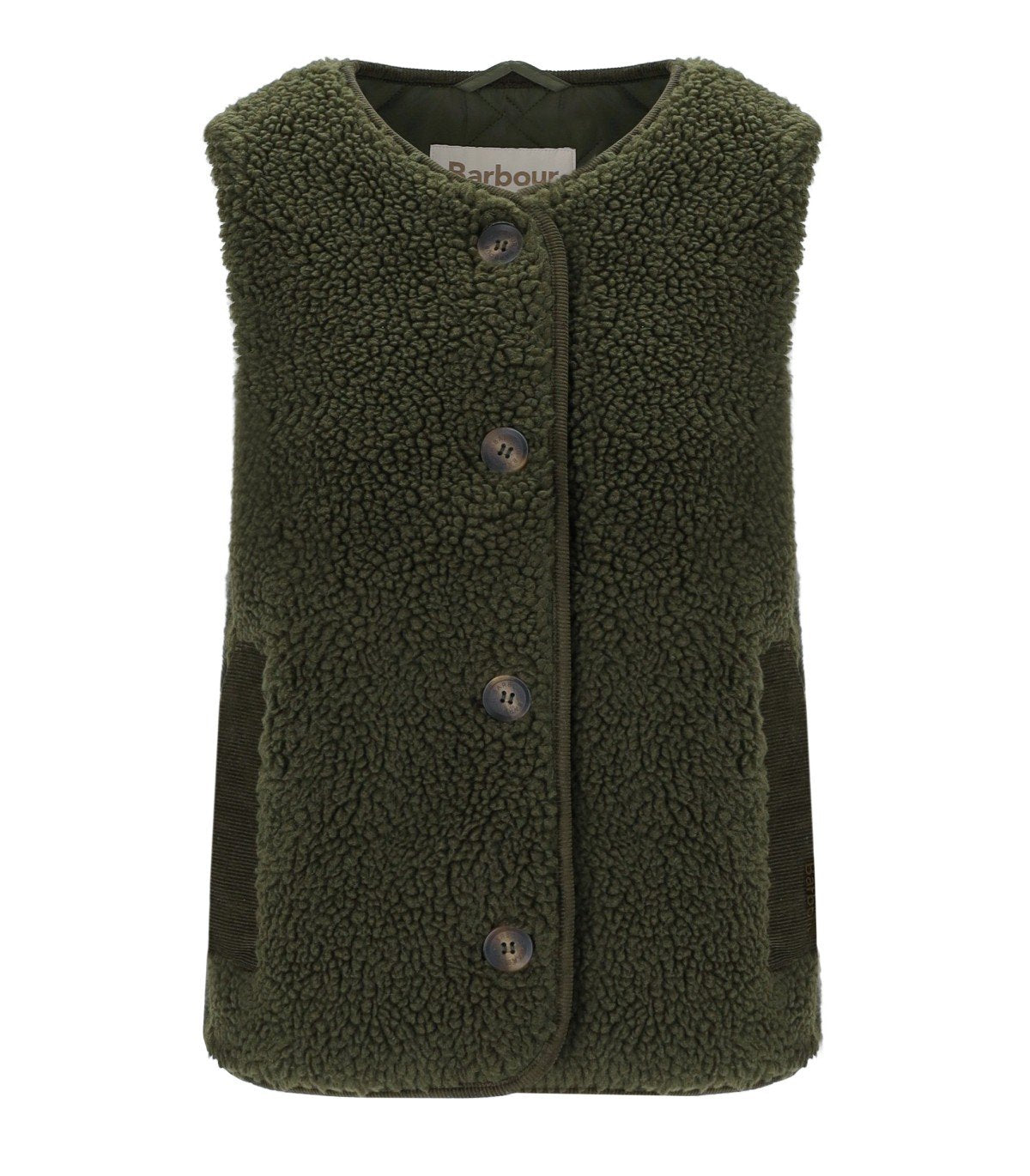 Barbour Luciana vest made from green teddy-effect fleece with a quilted nylon lining. Edges finished in ribbed cotton. Fastened with buttons, regular fit.
