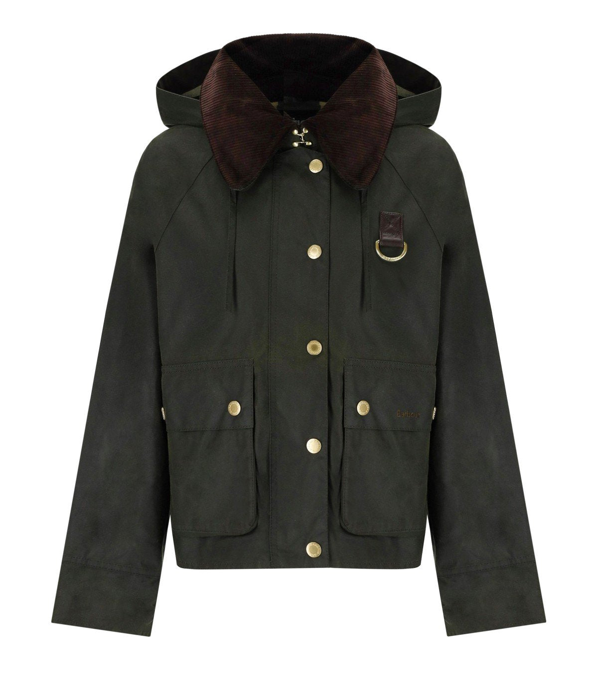 Barbour Reighton jacket is crafted from waxed cotton in olive green tones. It features a large corduroy collar in shades of brown, double patch pockets on the front with embroidered logo and branded buttons. Equipped with a drawstring hood, a D-ring detail on the chest, and a closure with zip, buttons, and a hook at the top. Relaxed fit.