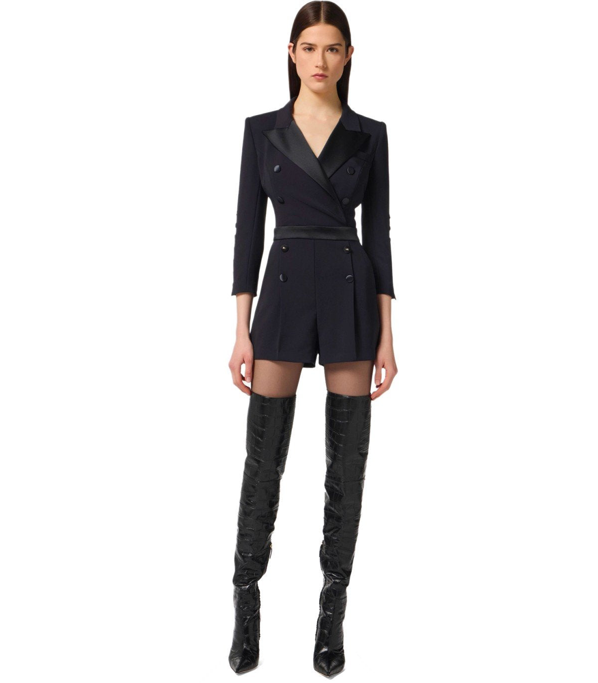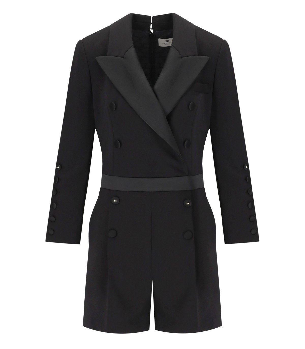 Elisabetta Franchi jumpsuit made of crepe in black tones. It features tuxedo-style details with front buttons that simulate a double-breasted closure. Equipped with 3/4 sleeves with buttons and padded shoulders. Zip and hook closure at the back. Slim fit.
