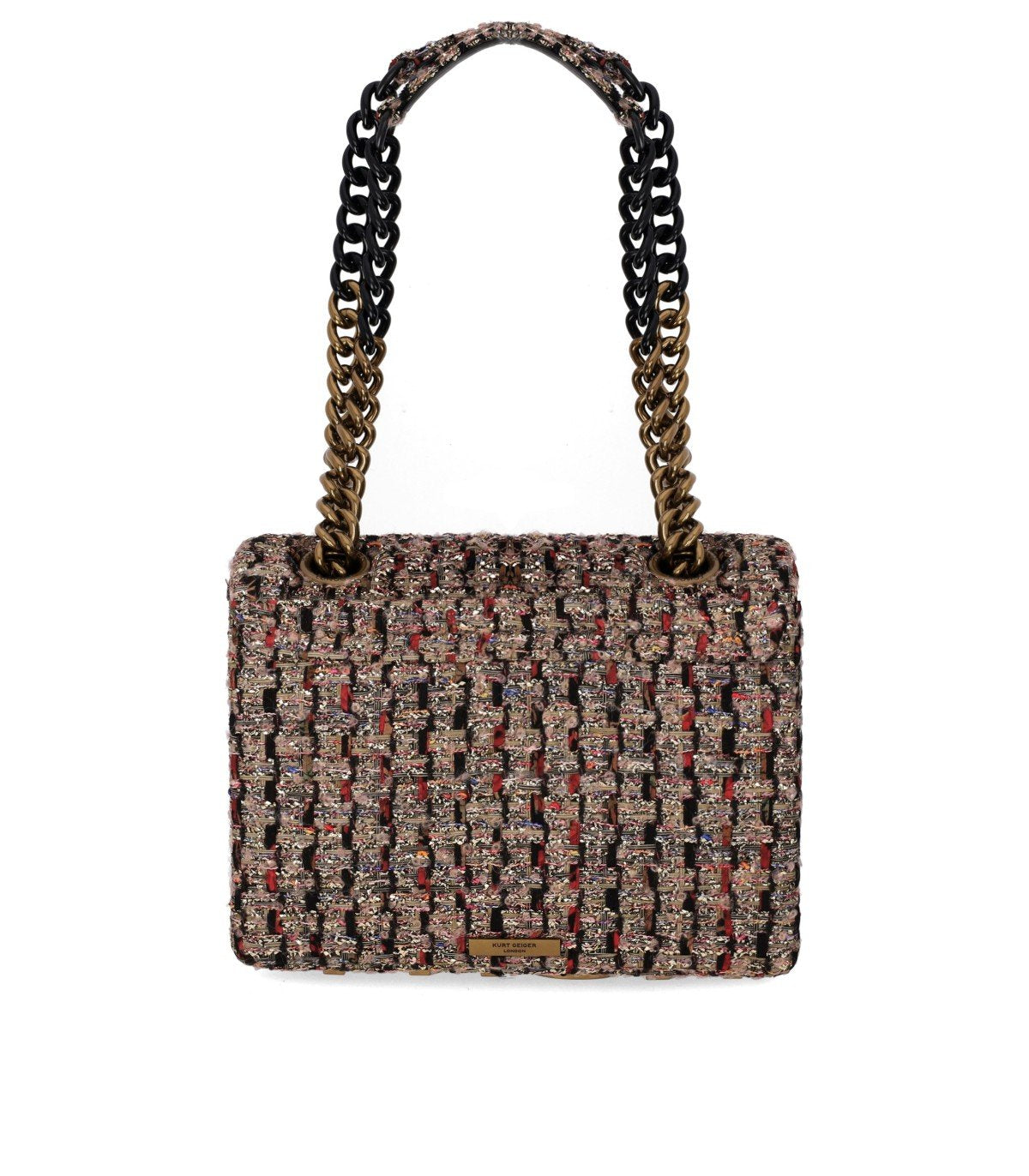 Large Kensington bag by Kurt Geiger made of multicolored tweed. It features a magnetic button closure, dual-tone chain double shoulder strap, and a front logo in black tones with matching rhinestones. Lined interior, double internal compartment, and card holder pocket. Gold-tone metal logoed base. Dimensions: 29x22x9 cm.