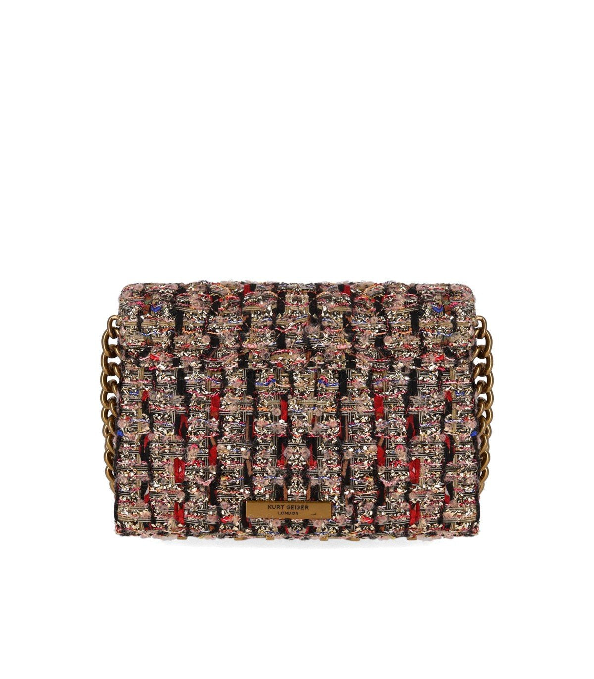 Kurt Geiger mini Kensington bag made of gold and multicolored tweed. Features a dual-tone chain double shoulder strap, a single-compartment interior with card slots. Iconic bird, the brand’s symbol, on the front and a large gold-tone metal logo on the bottom. Dimensions: 19.5x14x6 cm.
