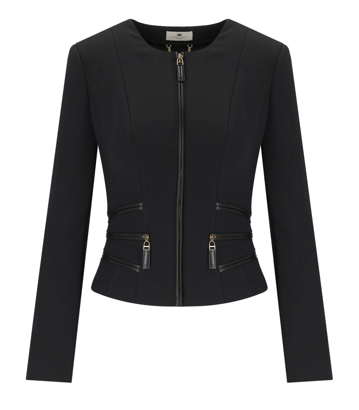 Jacket by Elisabetta Franchi made of double crepe in black tones. Featuring a zip closure, it has synthetic leather-effect finishes and details in matching tones that accentuate the waistline. Padded shoulders, lined. Slim fit.