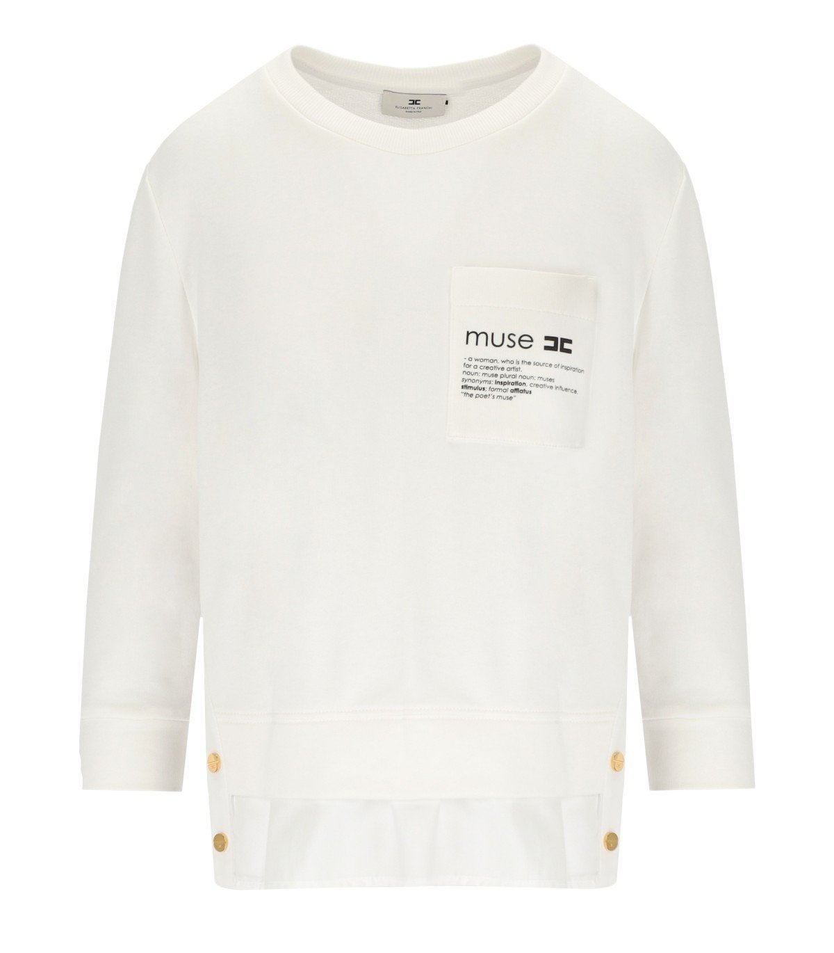 Elisabetta Franchi sweatshirt made from a cotton blend in ivory tones. Features a ribbed collar, 3/4 sleeves, and a contrasting logo pocket on the front. Characterized by a shirt-like poplin hem with side slits, gold-tone metal buttons, logo, and printed lettering on the back. Regular fit.