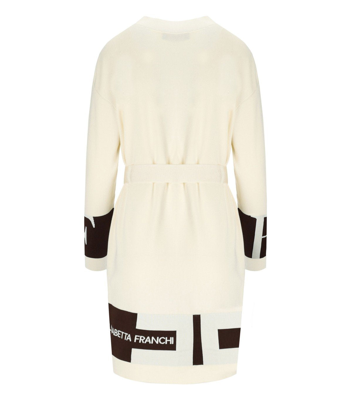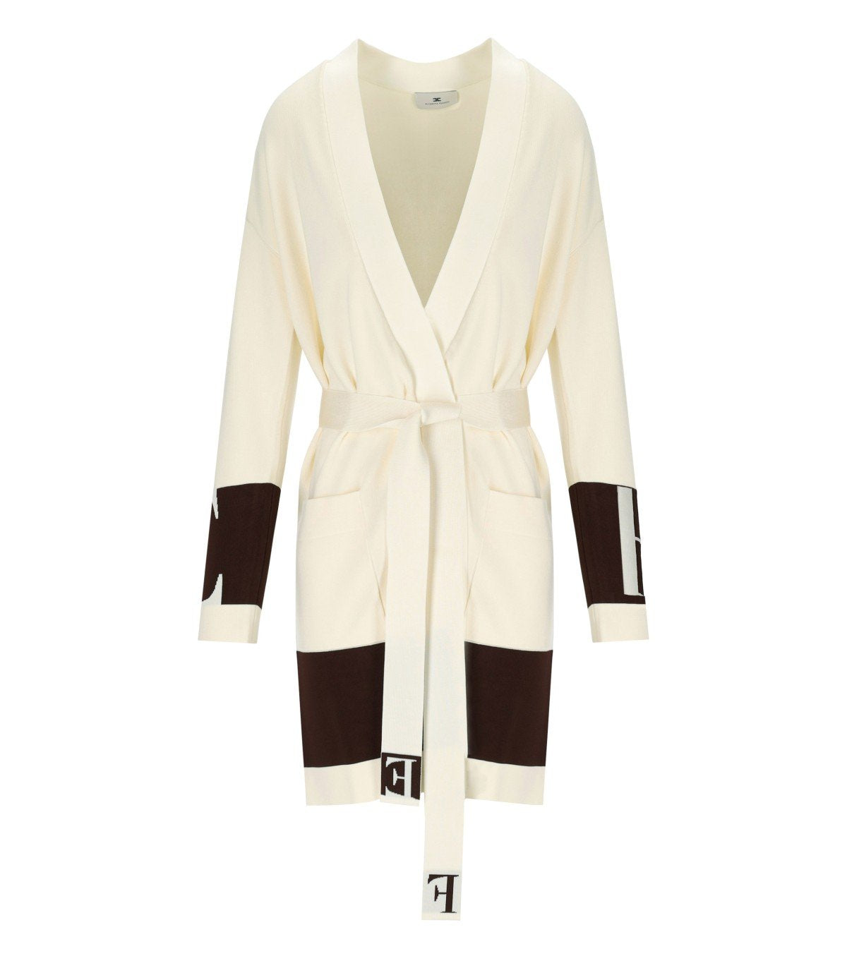 Elisabetta Franchi jumper made from a viscose blend in off-white tones. Featuring a robe-style cut and logoed details in shades of brown on the hem, sleeves, and back. Equipped with a logoed belt at the ends. Two patch pockets on the front. Regular fit.