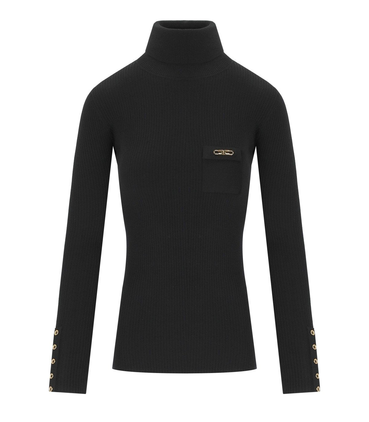 Elisabetta Franchi top made from a lyocell and silk blend with a ribbed pattern in shades of black. Features a turtleneck and a front pocket with a gold-tone metal logo. Slim fit.