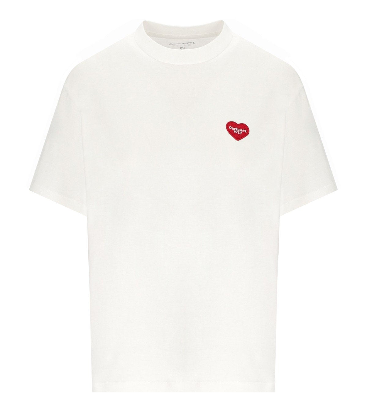 Carhartt WIP W's S/S Heart Patch T-shirt made from white cotton. Features a ribbed collar and a contrasting logo heart patch. Regular fit.