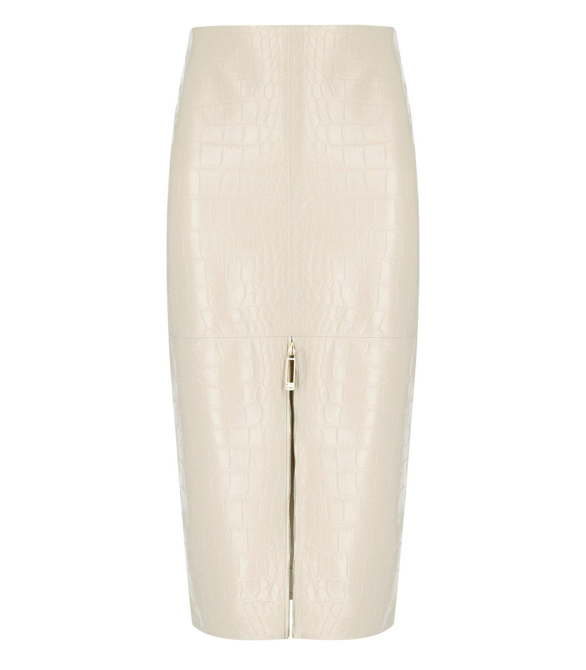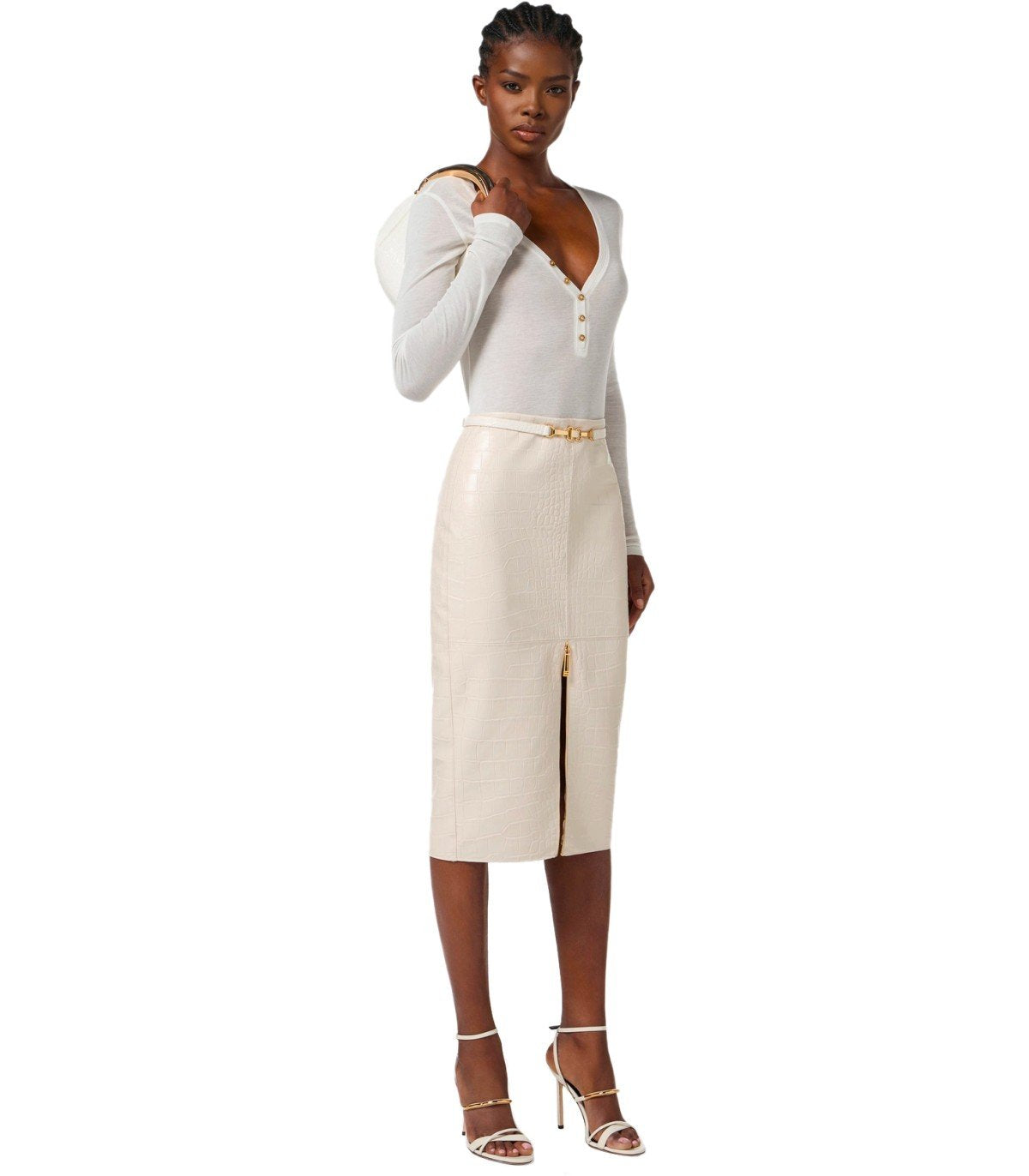 Elisabetta Franchi skirt made of synthetic leather with a crocodile print in milk white tones, featuring a front slit adjustable with a gold zipper. Back zip closure, lined. Slim fit.