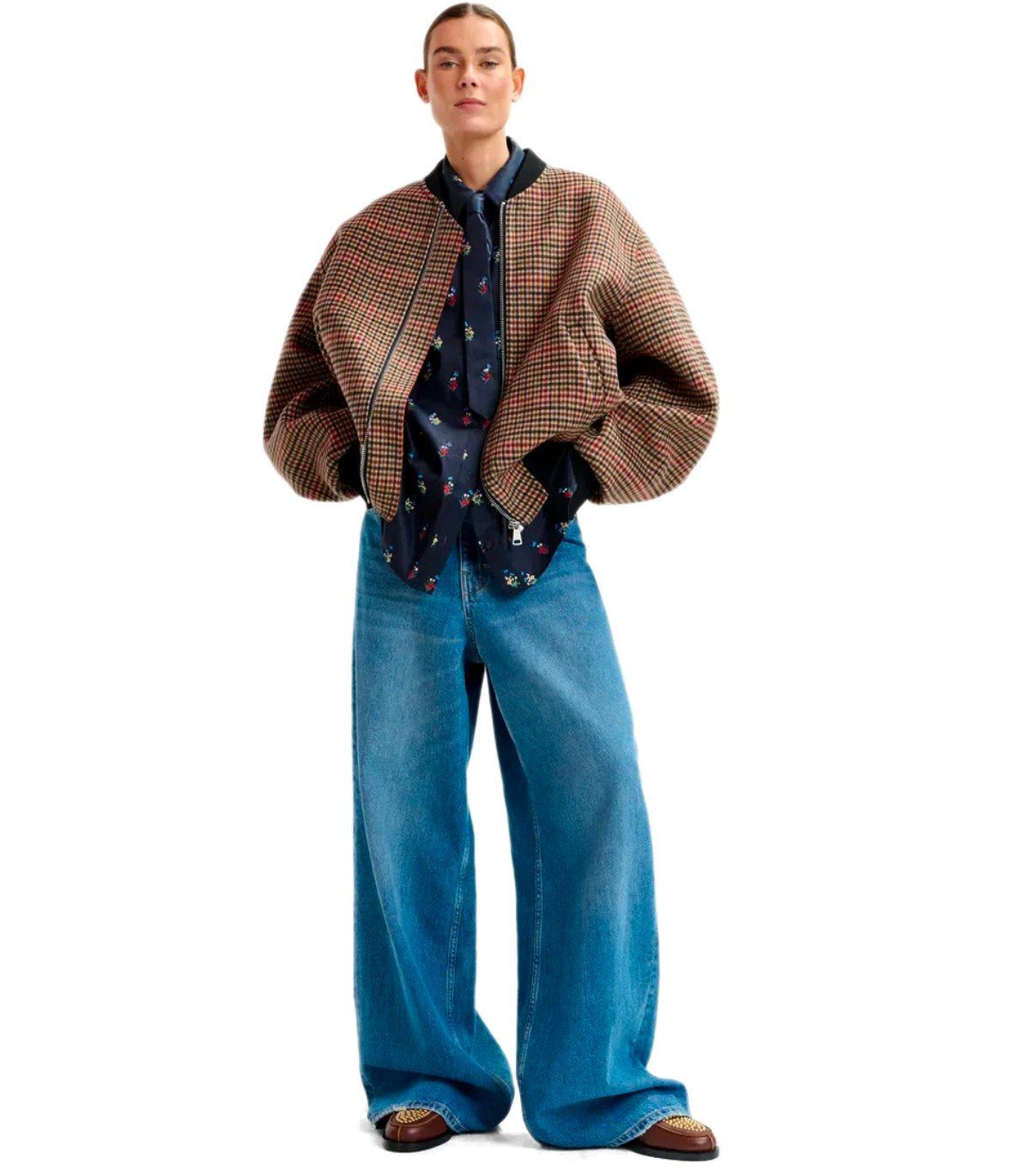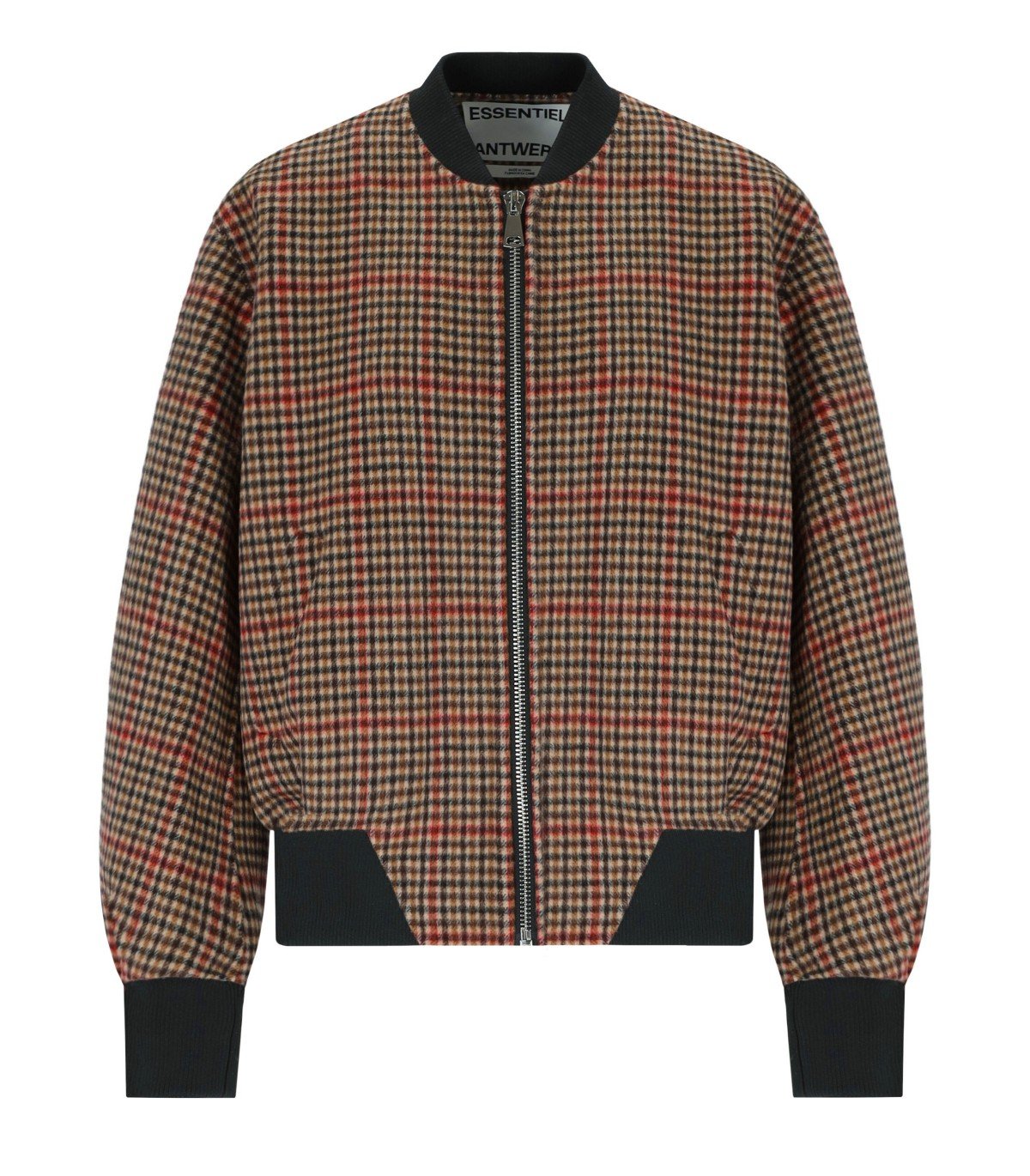 Essentiel Antwerp ITI bomber jacket made of wool with a tartan pattern in shades of black, brown, beige, and red. It features a wool lining with the same pattern, two front pockets, zip closure, and ribbed stretch fabric at the collar, cuffs, and hem. Oversized fit.