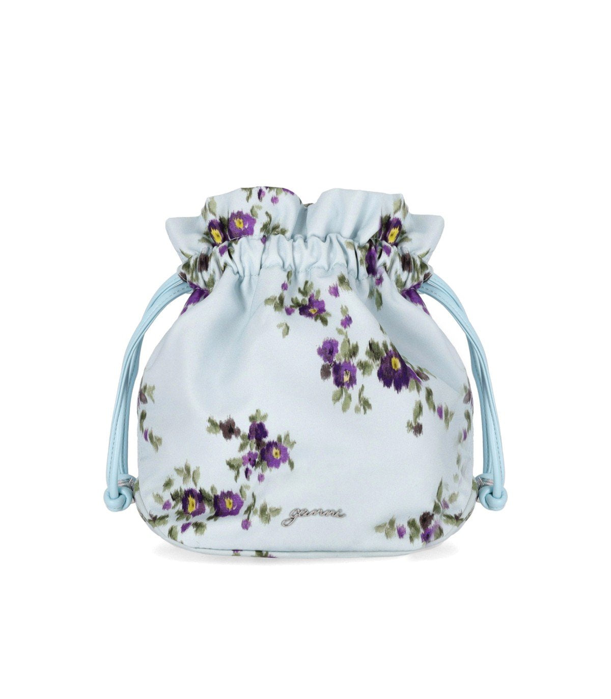 Ganni pouch made of light blue nylon, embellished with a floral pattern in shades of purple and green. Lined interior and drawstring closure finished with logoed metal cubes. Dimensions: 23x25x10 cm.