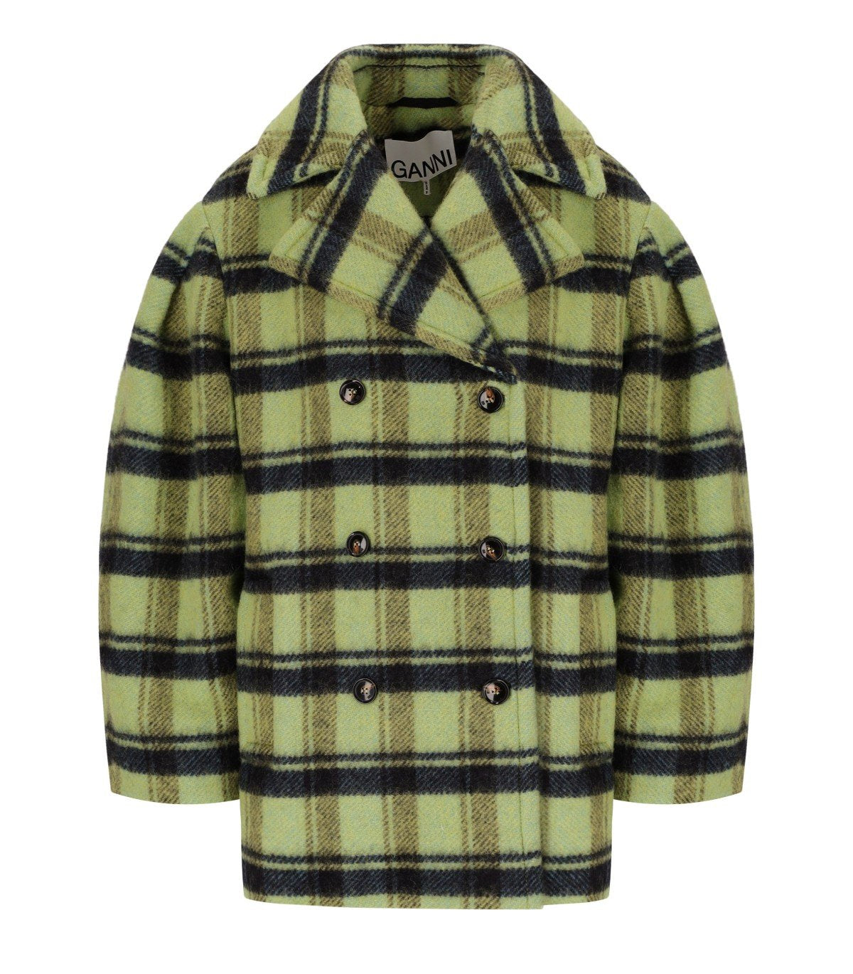 Ganni check coat made of wool with a check pattern in lime green and black tones. Features a double-breasted closure, notched lapel collar, and welt pockets on the front. Large pleat at the back of the garment. Oversized fit.