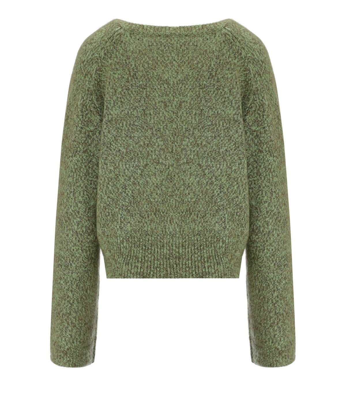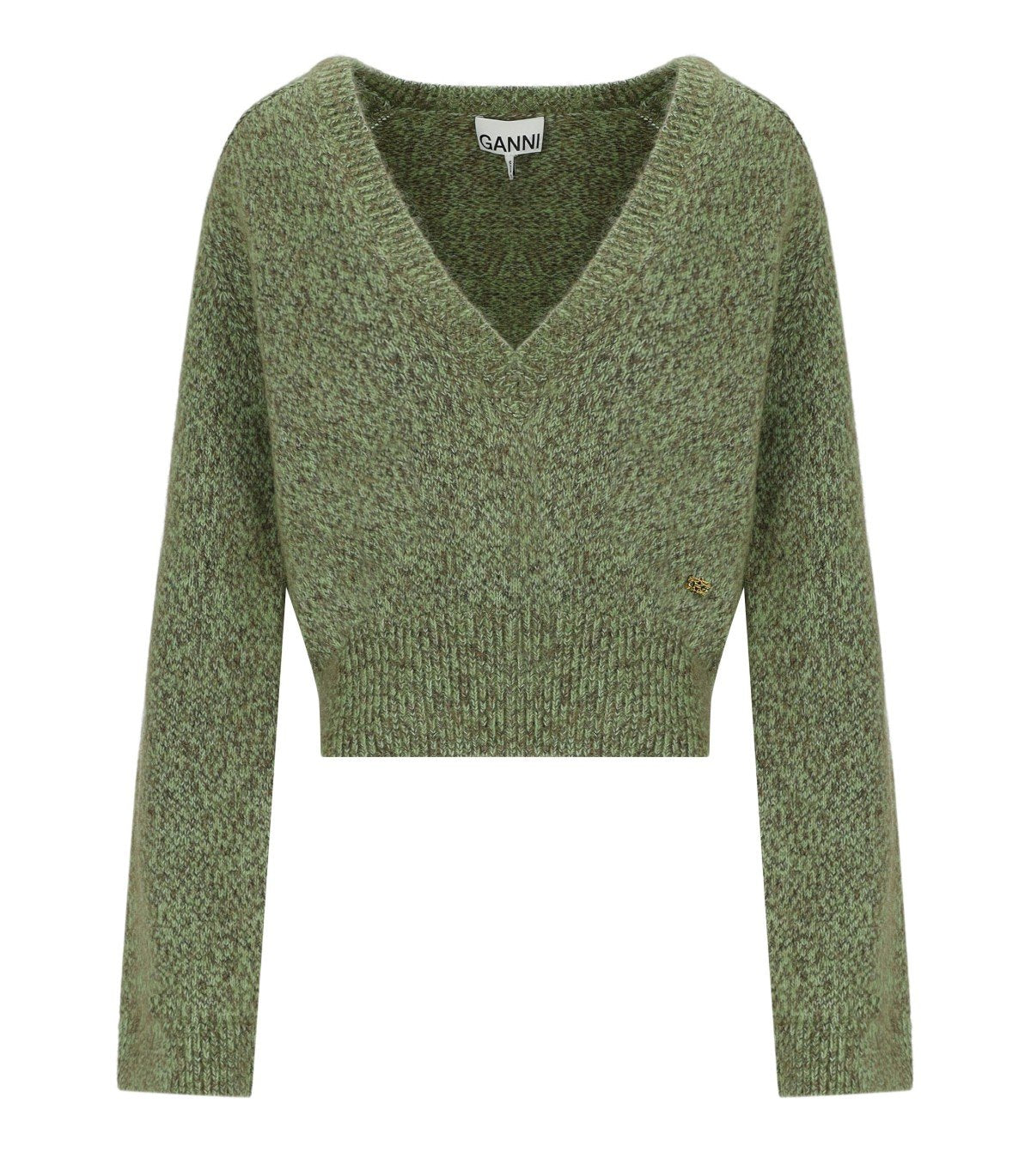Ganni jumper made from a wool and mohair blend in shades of green. It features a wide V-neckline and ribbed trims with the same knit as the main garment. Embellished with a gold logo charm on the front. Relaxed fit.