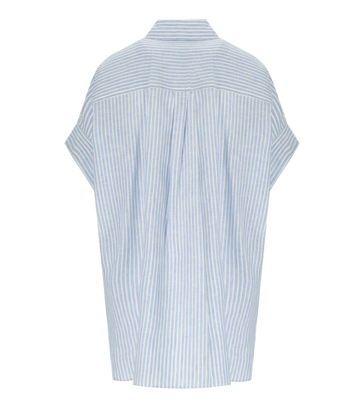 Max Mara Weekend Verve blouse made of linen, featuring a vertical striped pattern in white and light blue tones. Short batwing sleeves, buttoned collar, side slits at the hem. Slightly longer cut at the back. Relaxed fit.