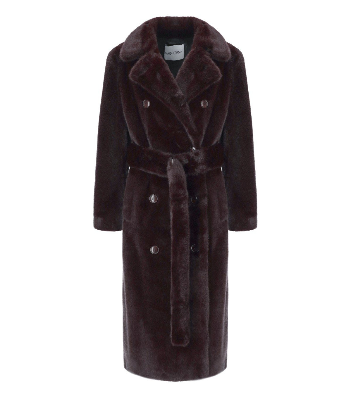 Jasmine coat by Stand Studio made of faux fur in merlot tones. It features a front closure with tone-on-tone buttons and a classic collar. Central slit at the back. Equipped with concealed welt pockets on the front and a matching belt with a metal buckle. Lined. Oversized fit.