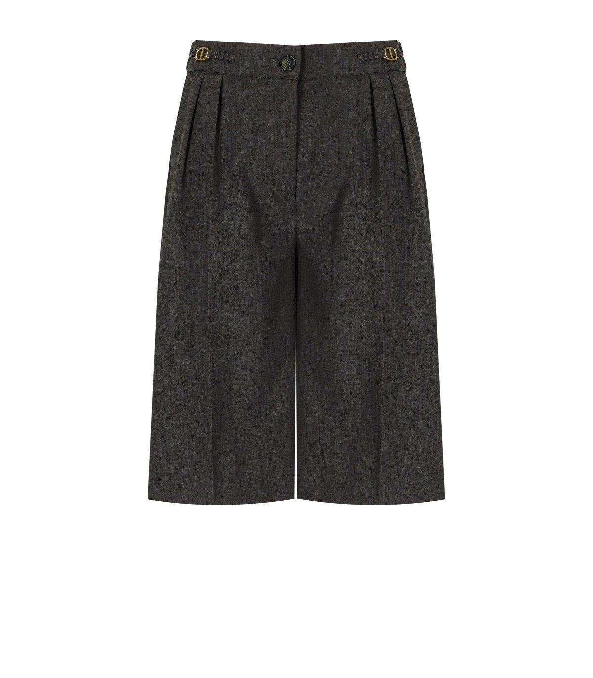 Twinset Bermuda shorts made from anthracite grey viscose blend. Featuring a gathered, elasticated waistband at the back, zip and button closure, and French pockets at the sides. Pressed crease at the front. Logo buckles at the waist. Relaxed fit.