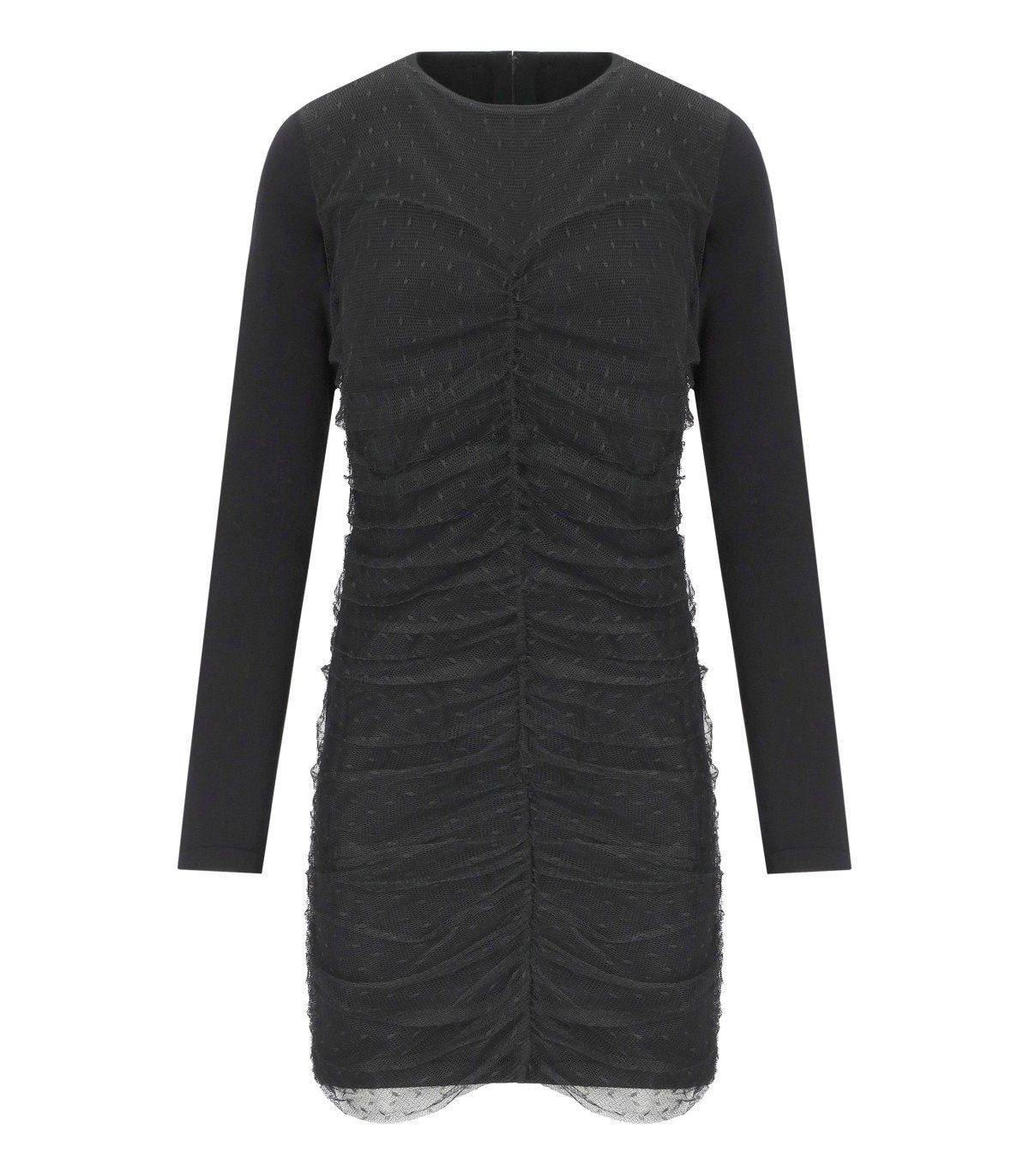 Twinset dress made from a viscose blend with gathered tulle overlay in shades of black. Features a zip closure at the back. Gold logo plaque. Slim fit.